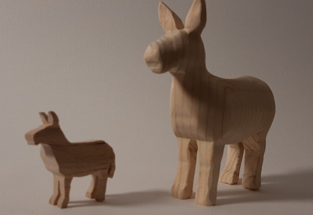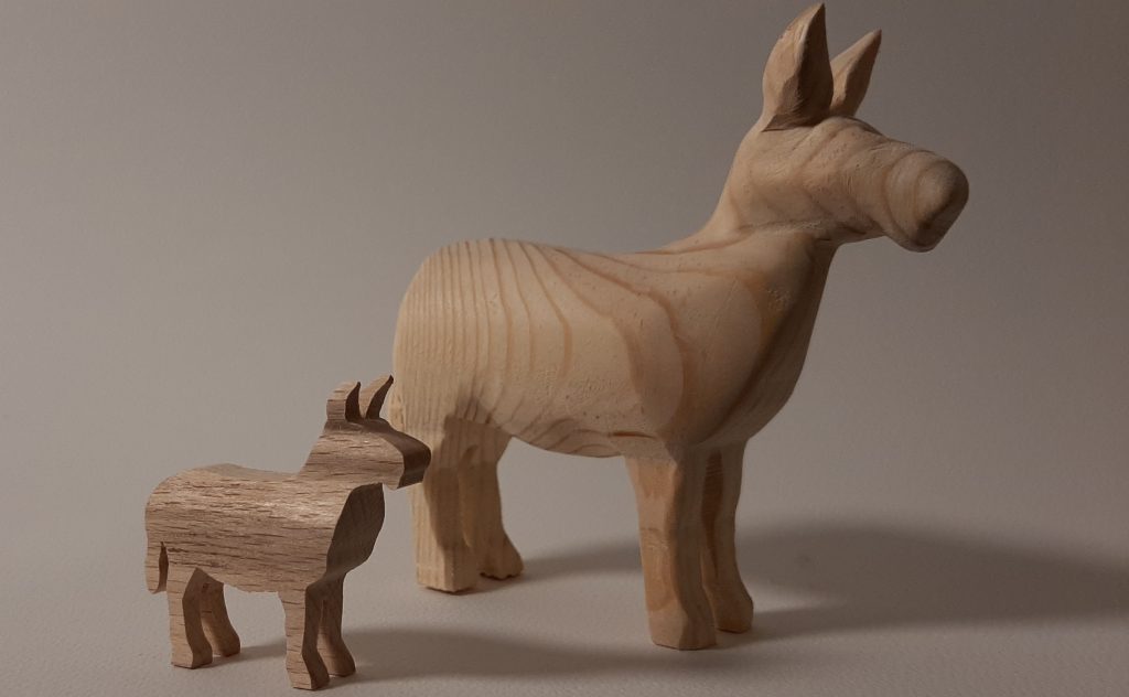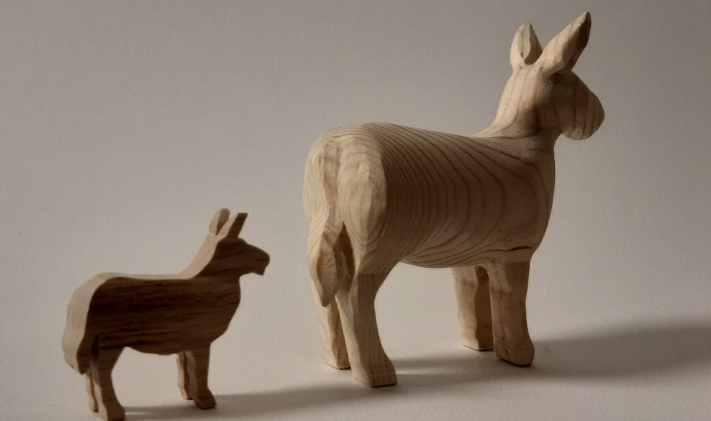 Für meine Schulprojekte habe ich schon öfters Tiere an meiner Pégas Bandsäge ausgesägt, welche die Kinder schleifen durften. Eine etwas ausgefeiltere Variante sind meine 3D Esel, welche ich sowohl an der Pégas Dekupiersäge als auch an der Bandsäge des gleichen Herstellers gesägt habe. Danach können die Holzrohlinge meditativ von Hand geschliffen werden.