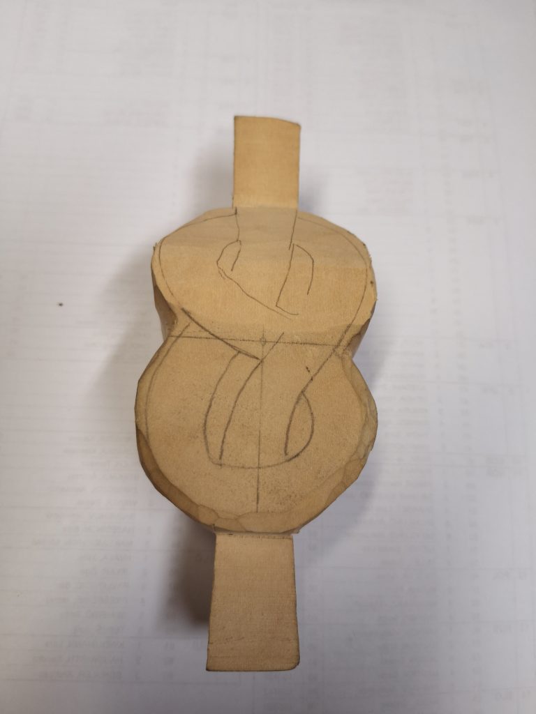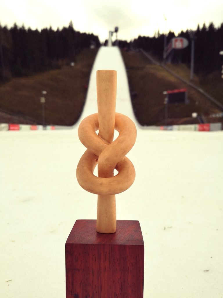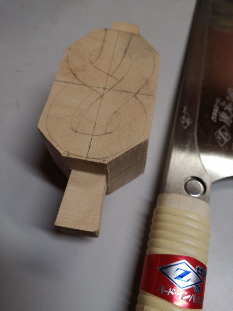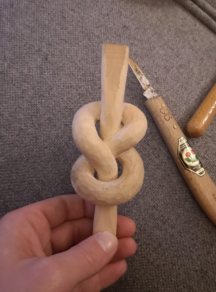 Der Achter Knoten wurde aus Lindenholz gefertigt. Zuerst habe ich eine Schablone gefertigt, mit deren Hilfe die Form auf beide Seiten des Lindenkantels übertragen wurde. Mit einer Dozuki Säge habe ich anschließend den Knoten grob zugesägt. Mit Schnitzmessern und Stechbeiteln wurde die Form dann immer weiter herausgearbeitet. Dies war, ebenfalls wie das Schleifen, sehr zeitintensiv und schwierig. Die Basis für den Knoten wurde aus Chakte Kok gefertigt.