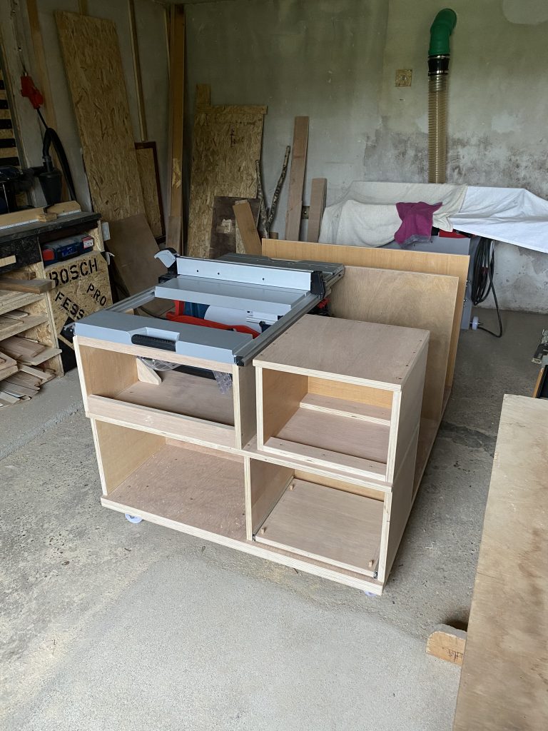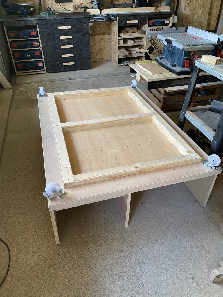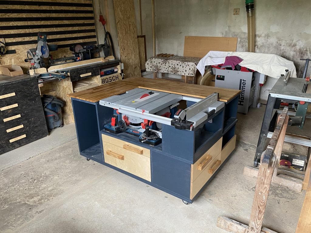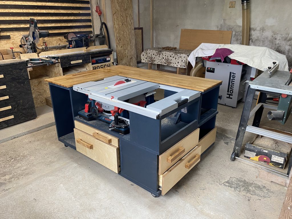 Hier der Bau meines Herzstücks in der Werkstatt, die Arbeitsinsel. Gebaut aus Pappel-Wohnwagen-Mehrschichtplatten, etwas Eiche Leimholz als Arbeitsfläche, OSB und Multiplex für die Schubladen. Lackiert mit 2-K-Lack und zum Schluss noch mit Klarlack drüber.