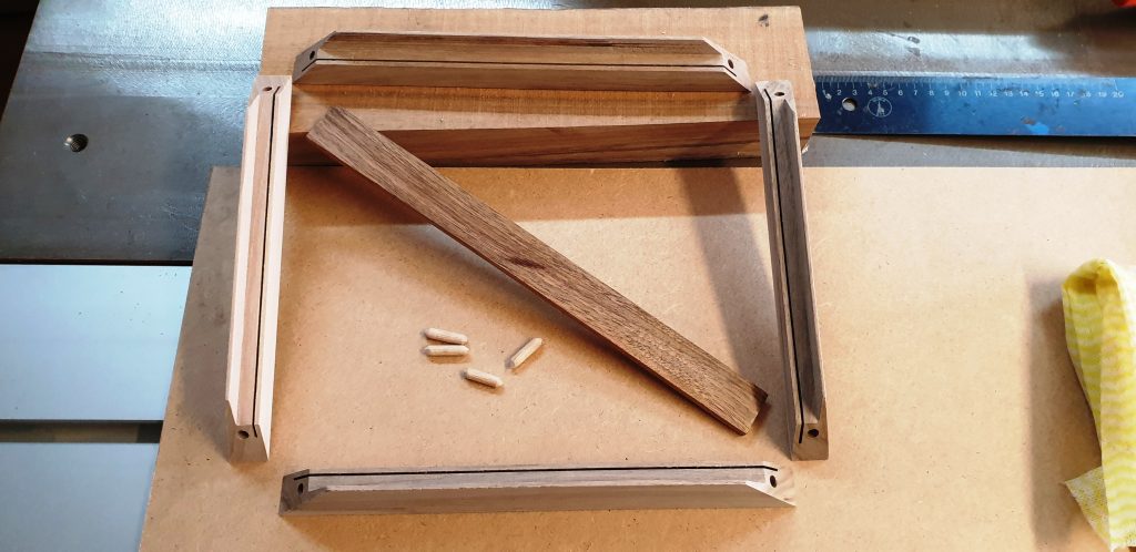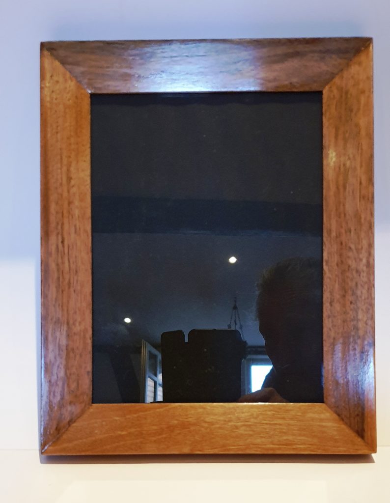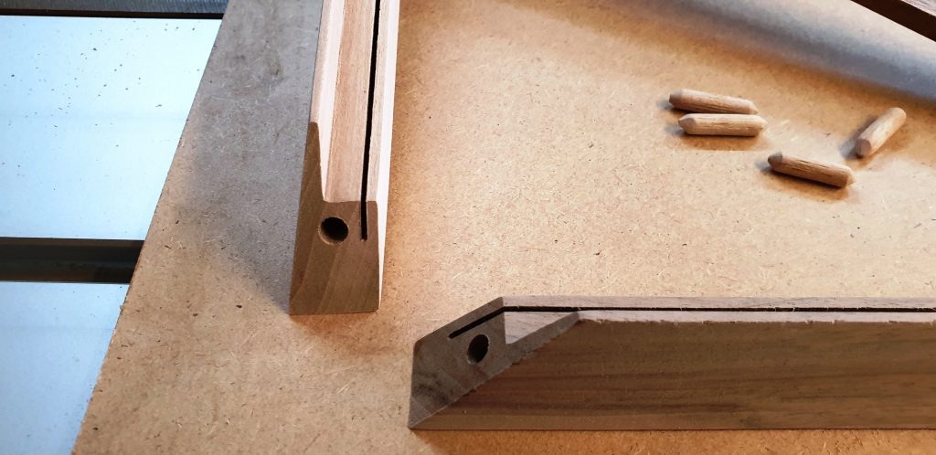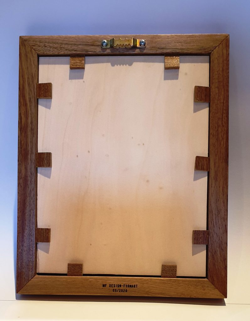 Der Bilderrahmen hat ein schräges Profil sowie eine Nut für die Befestigungskeile. Die Gehrungsverbindung wird mit Dübeln verleimt. Glas und Rückwand aus Pappel werden von Keilen aus Nussbaum sicher gehalten und lassen sich ohne Werkzeug austauschen. Die Aufhängung aus Messing ist justierbar.