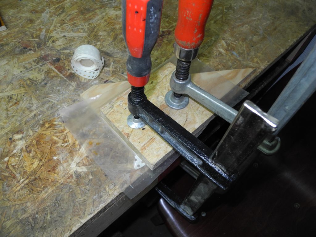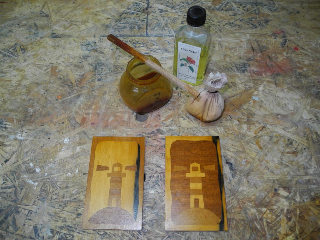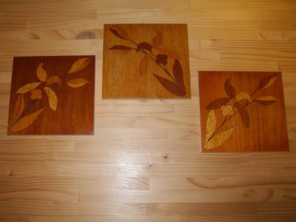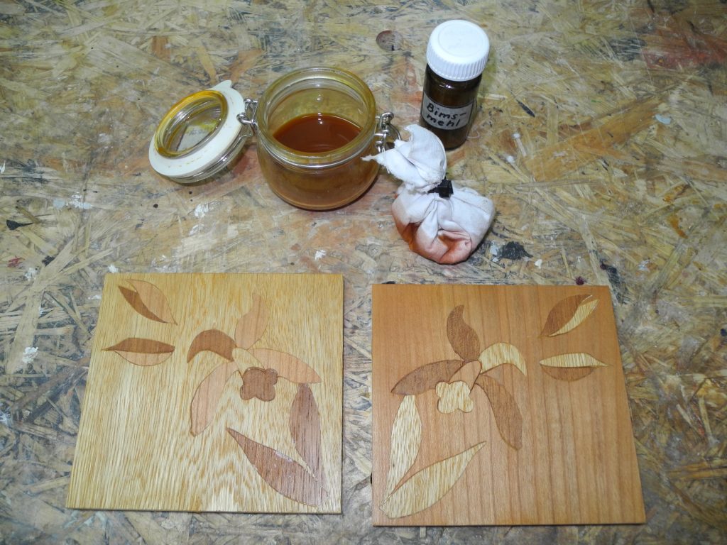 Für dieses kleine, kurvenreiche Motiv entschied ich mich für die Sägetechnik und benutzte lediglich 3 verschiedenfarbige Furniere (Kirsche, Eiche, Mahagoni). Zunächst wurden die Furniere durch Wasserdampf und Pressen geglättet, ansonsten gelingt die Furnierarbeit nicht. Nach dem Aussägen hat man bei drei verschiedenen Furnieren drei verschiedene Möglichkeiten, das Motiv zu legen. Nach dem arrangieren werden zum Verrutschen gefährdete Bereiche mit Fugenleimpapier verklebt und das Motiv auf eine Trägerplatte aufgeleimt. Hier sollte kein Leim durchschlagen, ansonsten bekommt man nur schwer entfernbare Flecken. Anschließend kann die Marketerie geschliffen und die Oberfläche mit der Schellackpolitur aufbereitet werden. Ich entschied mich für die klassische Französische Politur und füllte die Poren der rauen Mahagoni und die im Furnier entstandenen Fugen mit Bimsmehl und 40% verdünnter Schellacklösung. In der Schlusspolitur nutzte ich Kamelienöl und meine selbst angesetzte Stammlösung.