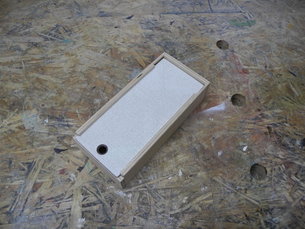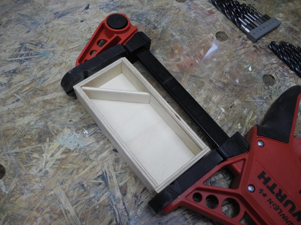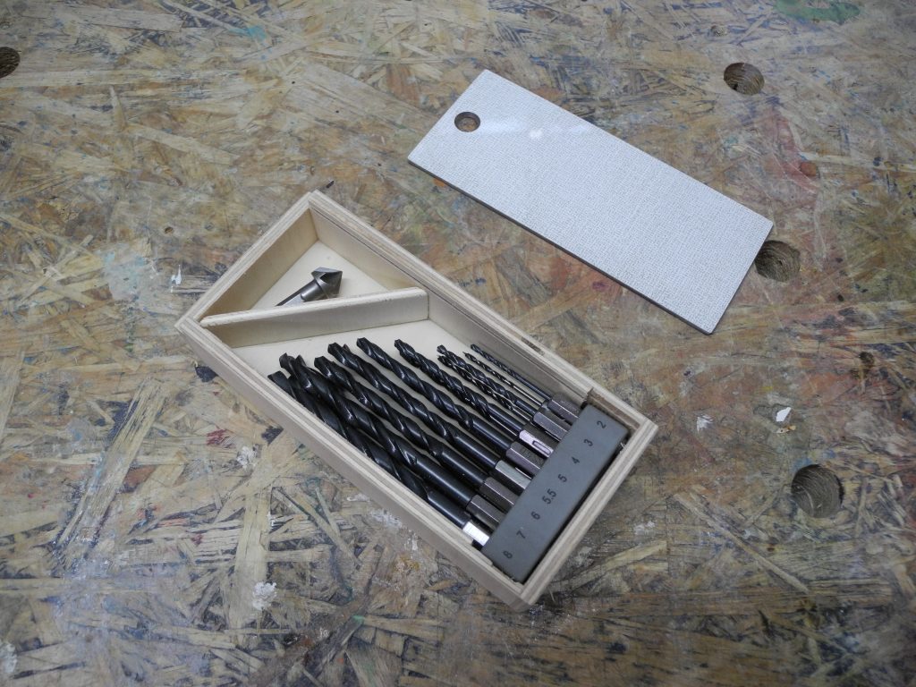 Ich habe für den Schlagschrauber neue Bohrer mit Sechskantaufnahme angeschafft, allerdings gab es dazu keine vernünftige Box, worin diese transportiert werden konnten – somit musste eine Box selbst gebaut werden. Die Seiten sind aus Multiplex gefertigt und für den Boden und den Deckel (ein altes Schneidbrettchen aus HPL) eingenutet. Weiterhin wurde an der unteren Seite der beiden Korpusteile eine Stufe eingefräst, sodass die Kunststoffhalter, in denen die Bohrer klemmen, nicht verrutschen, sobald ein Bohrer entnommen wird.
