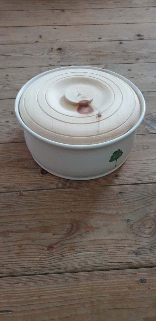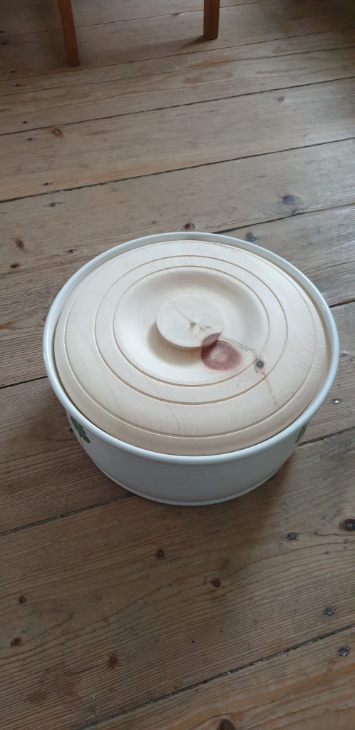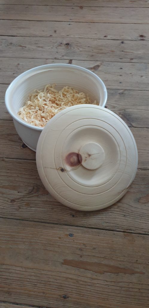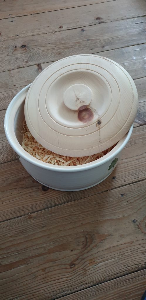 Deckel für Brottopf 28. Oktober 2022Drechselarbeiten, Neue BeiträgeMarkus WAGNERNeuen Deckel für Brottopf aus Ton, der alte war gebrochen und mehrfach geklebt, gedrechselt aus Zirbenholz.teilen teilen merken