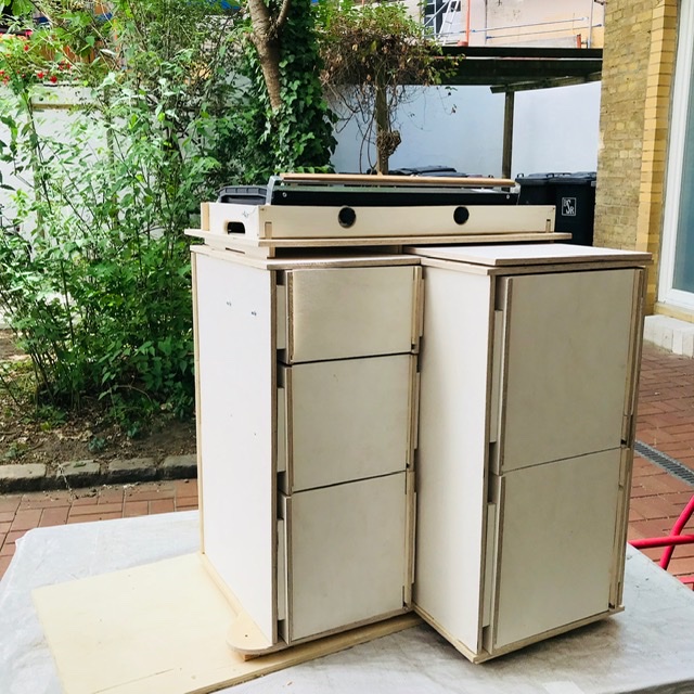 Da nichts verleimt oder verschraubt ist, lässt sich das gesamte Konstrukt, wenn gewünscht, werkzeuglos zerlegen und wer über zusammen stecken. Das Top-Teil mit dem Herd kann abgenommen werden, um z.B. draußen vor dem Bus schonmal Kaffee zu kochen, während jemand anderes noch schläft .. oder um die Küche in drei Teile zerlegt über den Winter aus dem Bus zu nehmen.