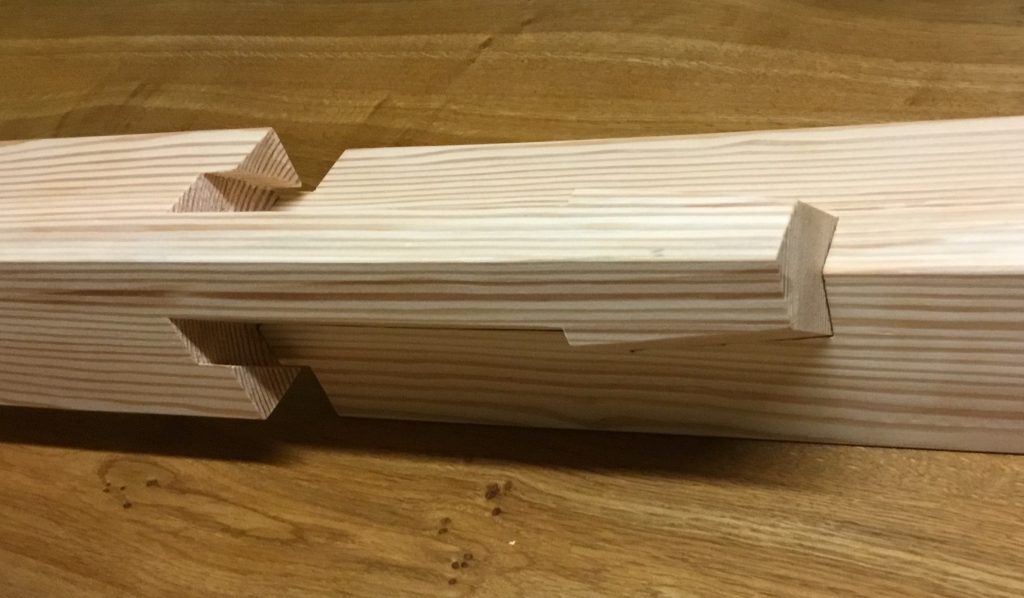 Dies ist eine diagonale Schwalbenschwanz Längsverbindung. Diese Holzverbindung stammt aus der japanischen Handwerkskunst.