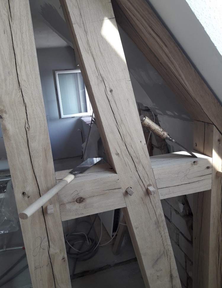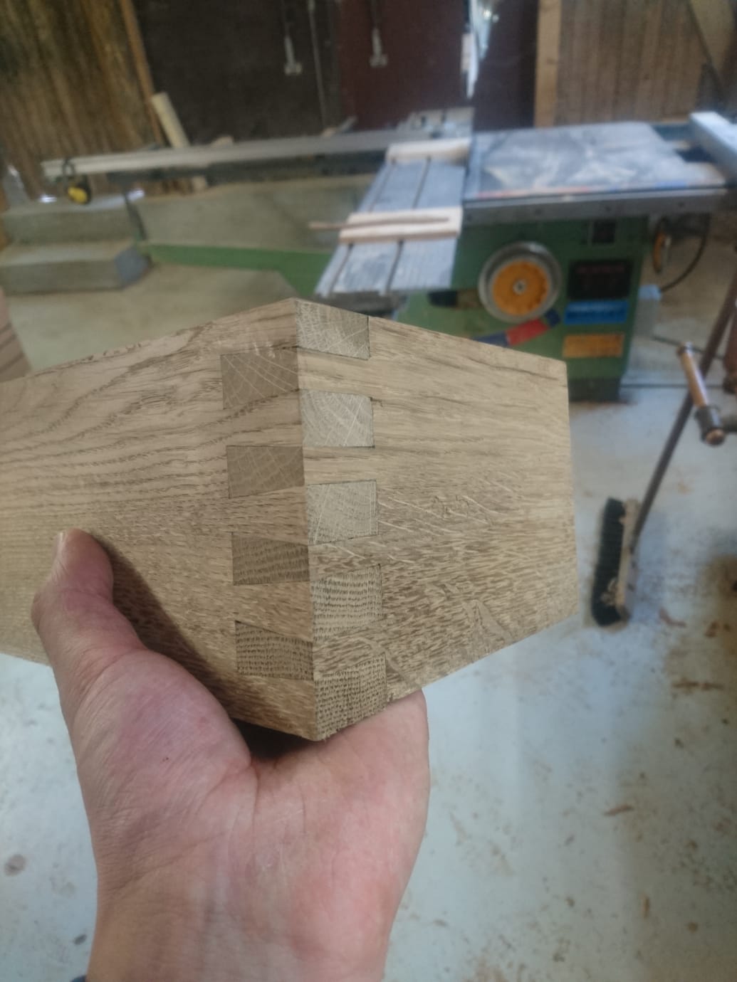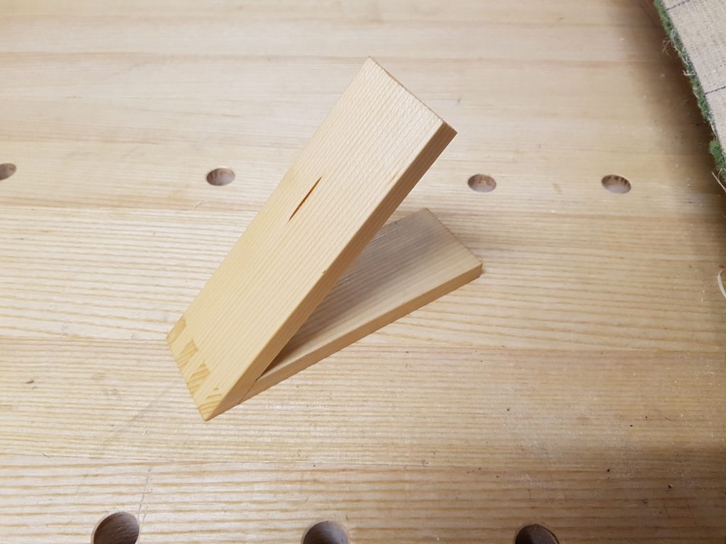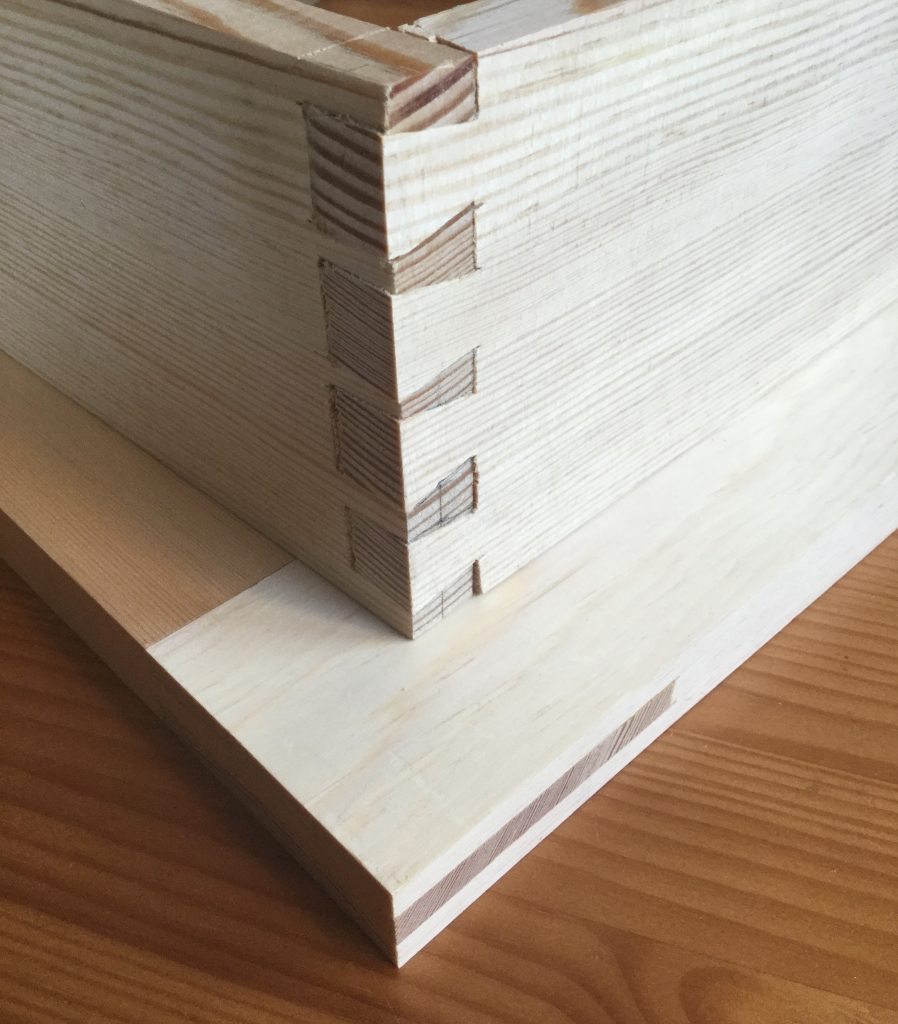 Nach dem Verleimen wurden die Leisten zusammen mit den überstehenden Zinken abgesägt und beigehobelt. Als Werkzeuge wurde u.a. diverse Stemmeisen, Japansägen und Handhobel benutzt.