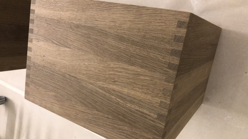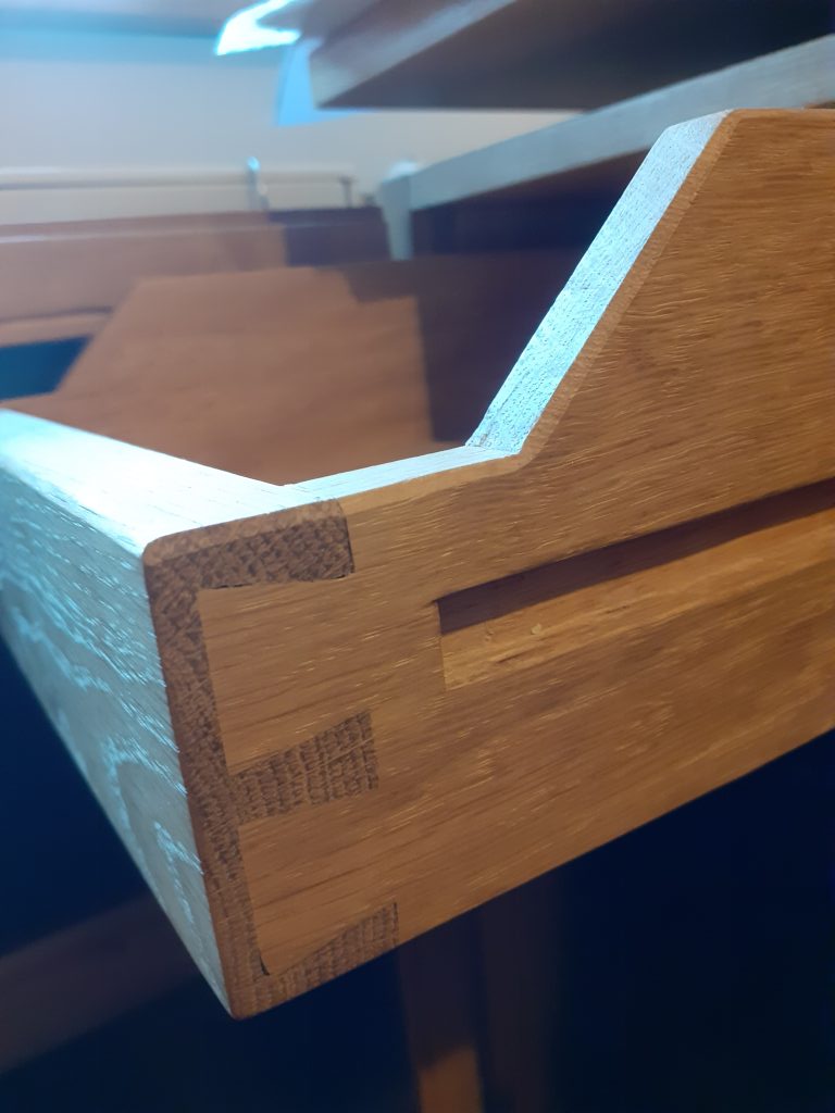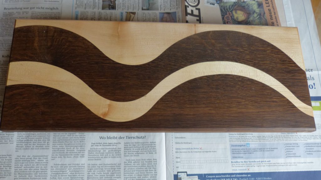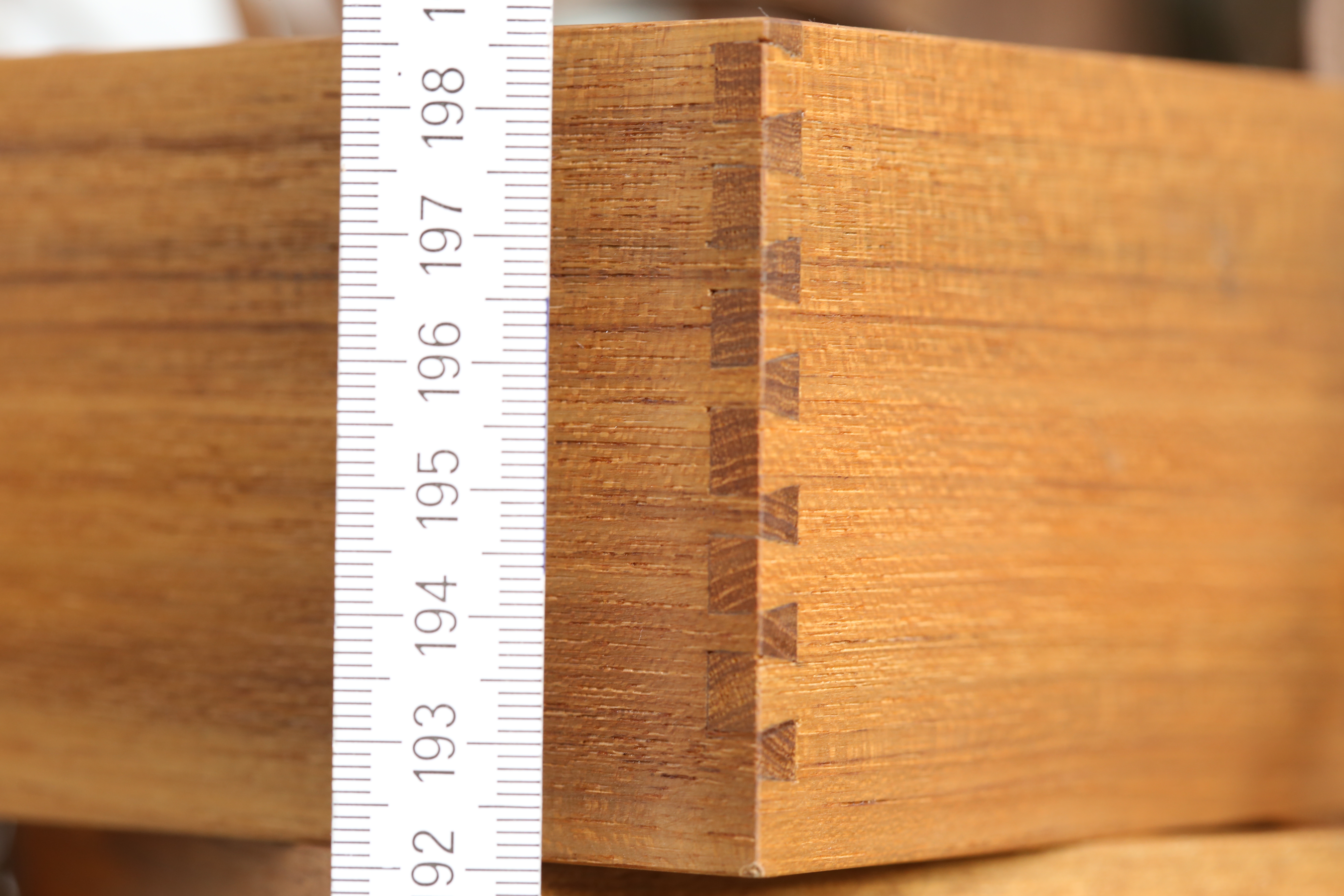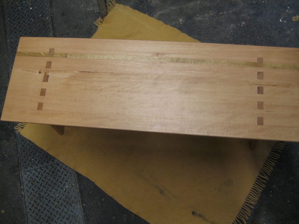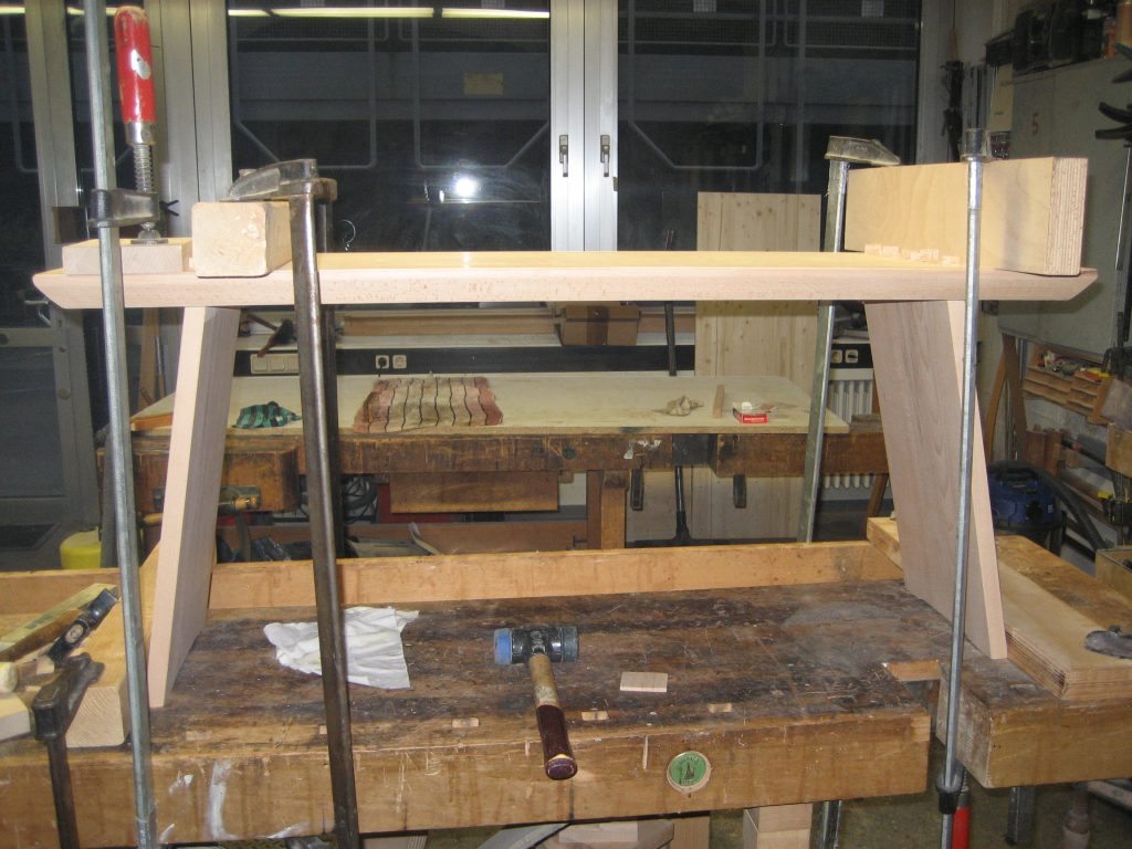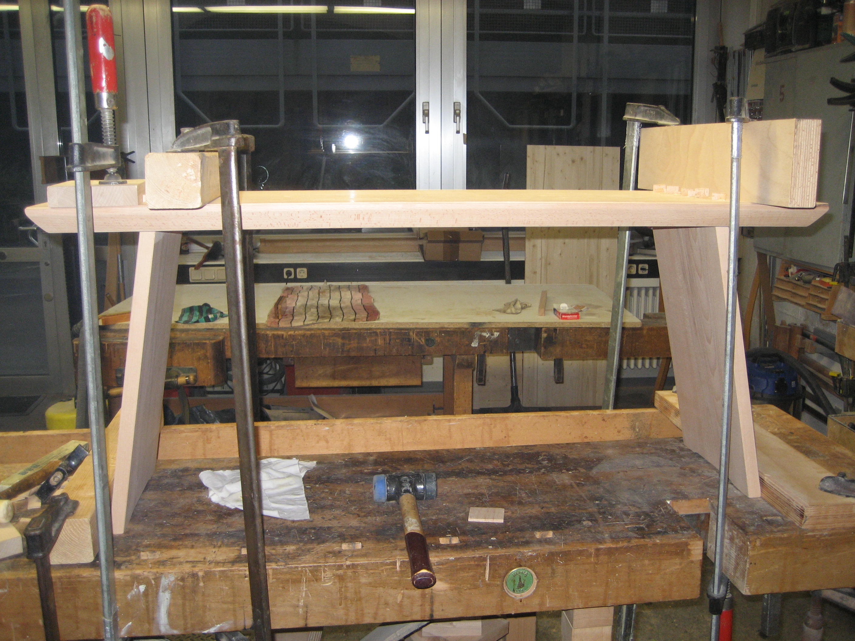 Aus Kernbuche mit einem eingeleimten Stück Eiche; Maße 1170x500x380 mm(LxHxB) und Dicke 40 bzw. 23 mm; Zinken und Zinkenlöcher mit 10 Grad-Schräge von Hand gesägt bzw. gestemmt unter Verwendung von Akagashi-Ryoba Sägen (712120) und verschiedene Oire Nomi (710137); geglättet und gefast mit Dictum Einhandhobel (703340), japanischem Schabhobel (717015), sowie Schlichthobel (703980) und verleimt mit Titebond Original (450361); geölt und gewachst; handwerklich erzeugtes Unikat.