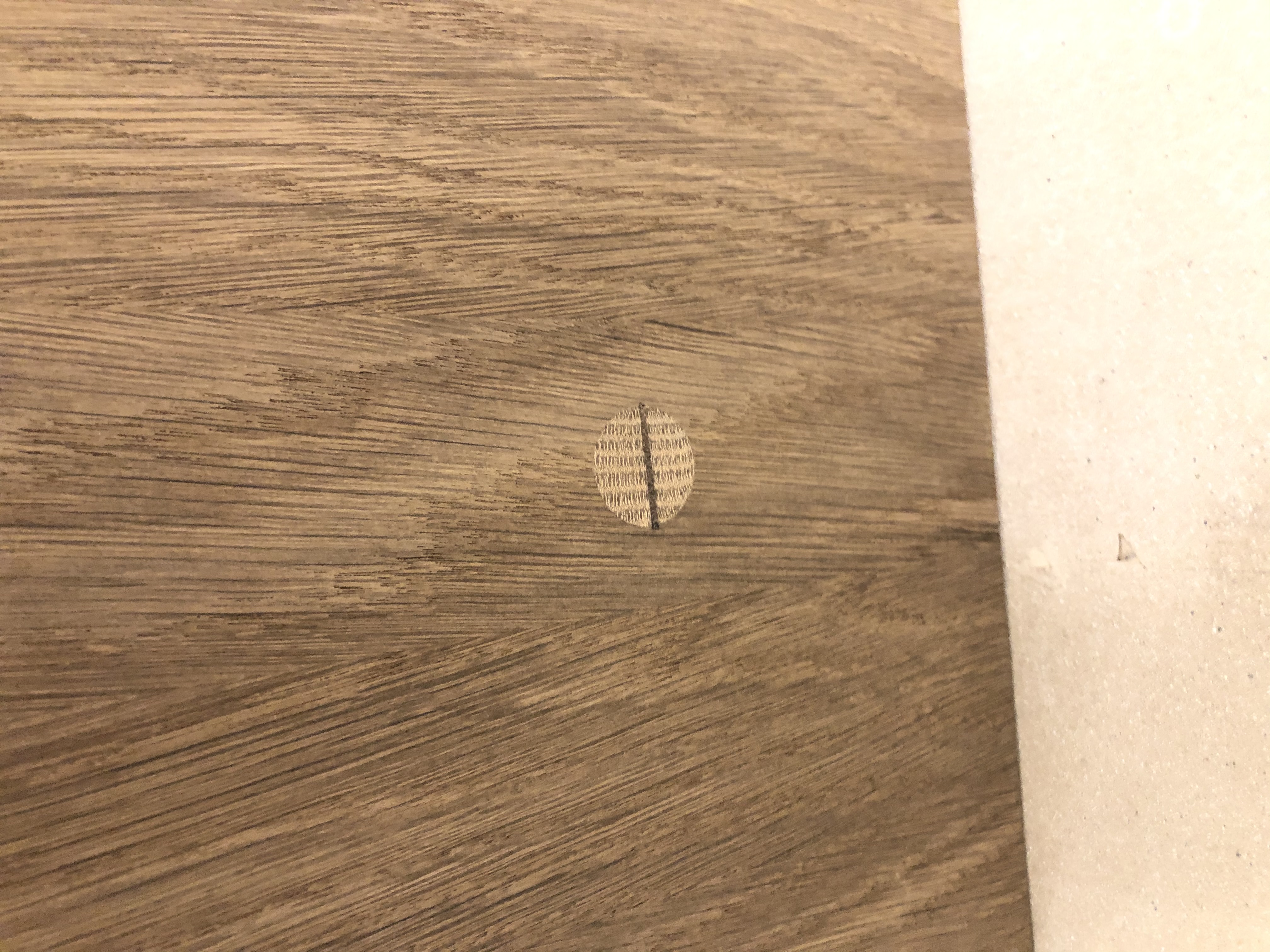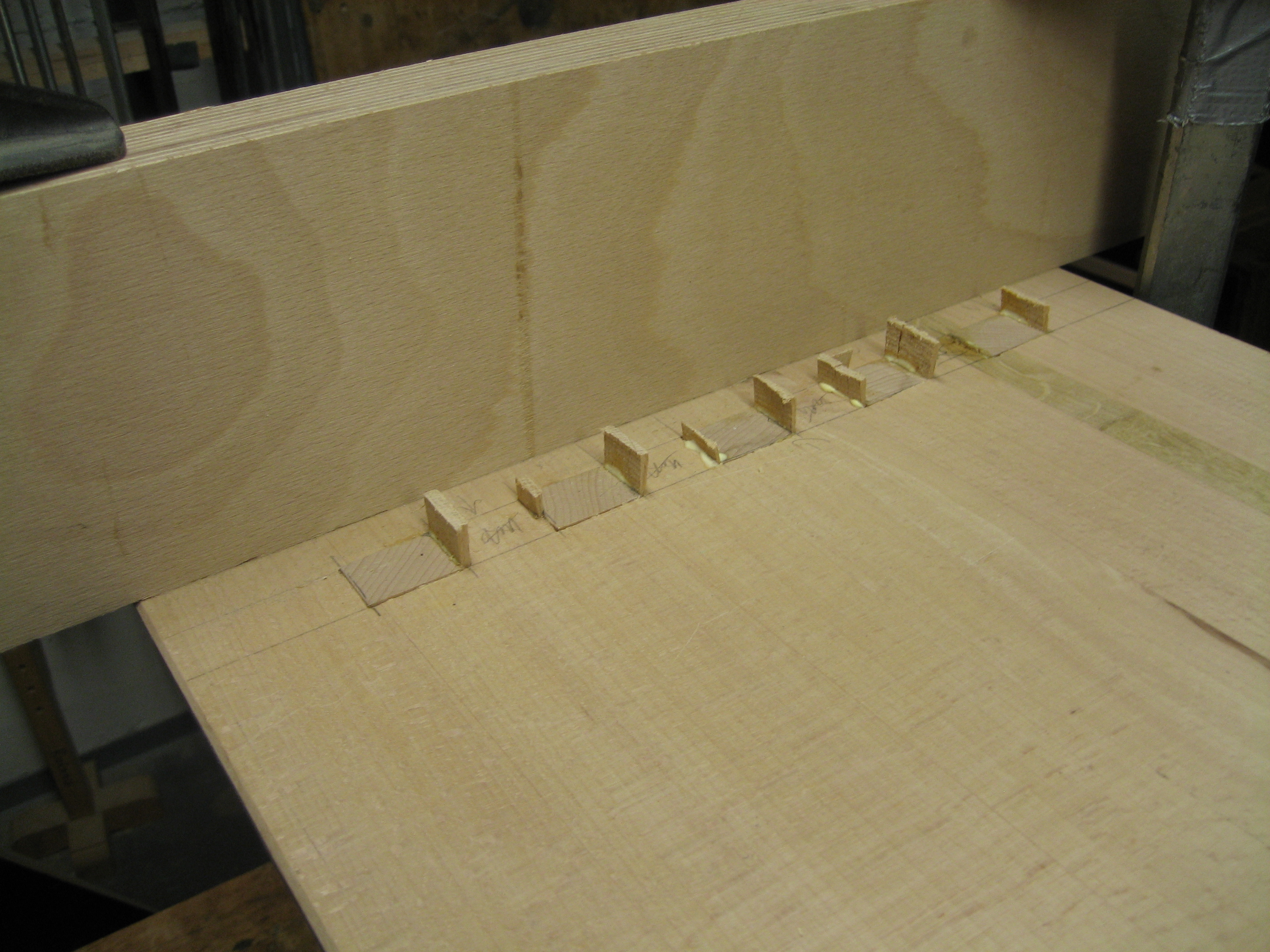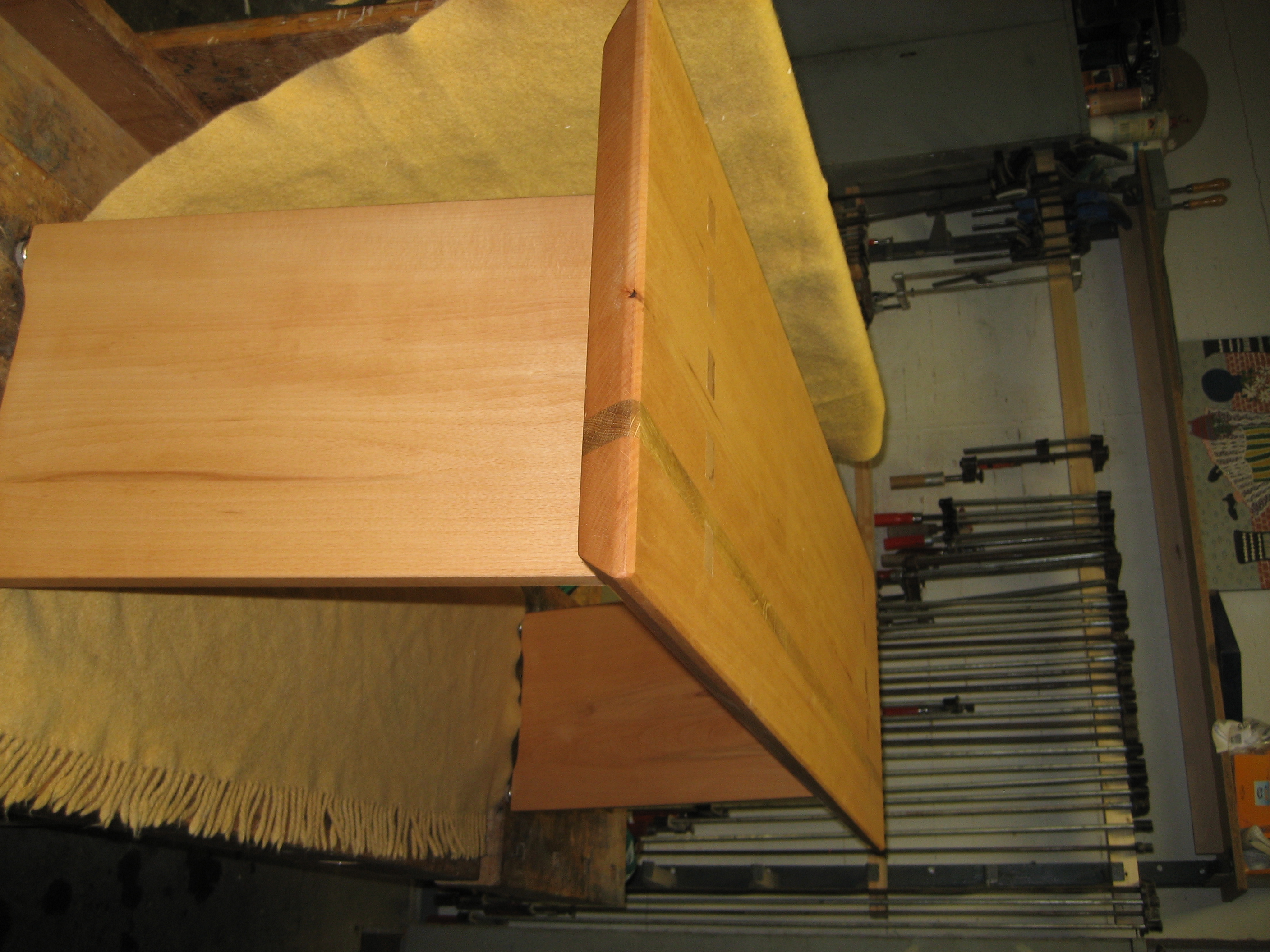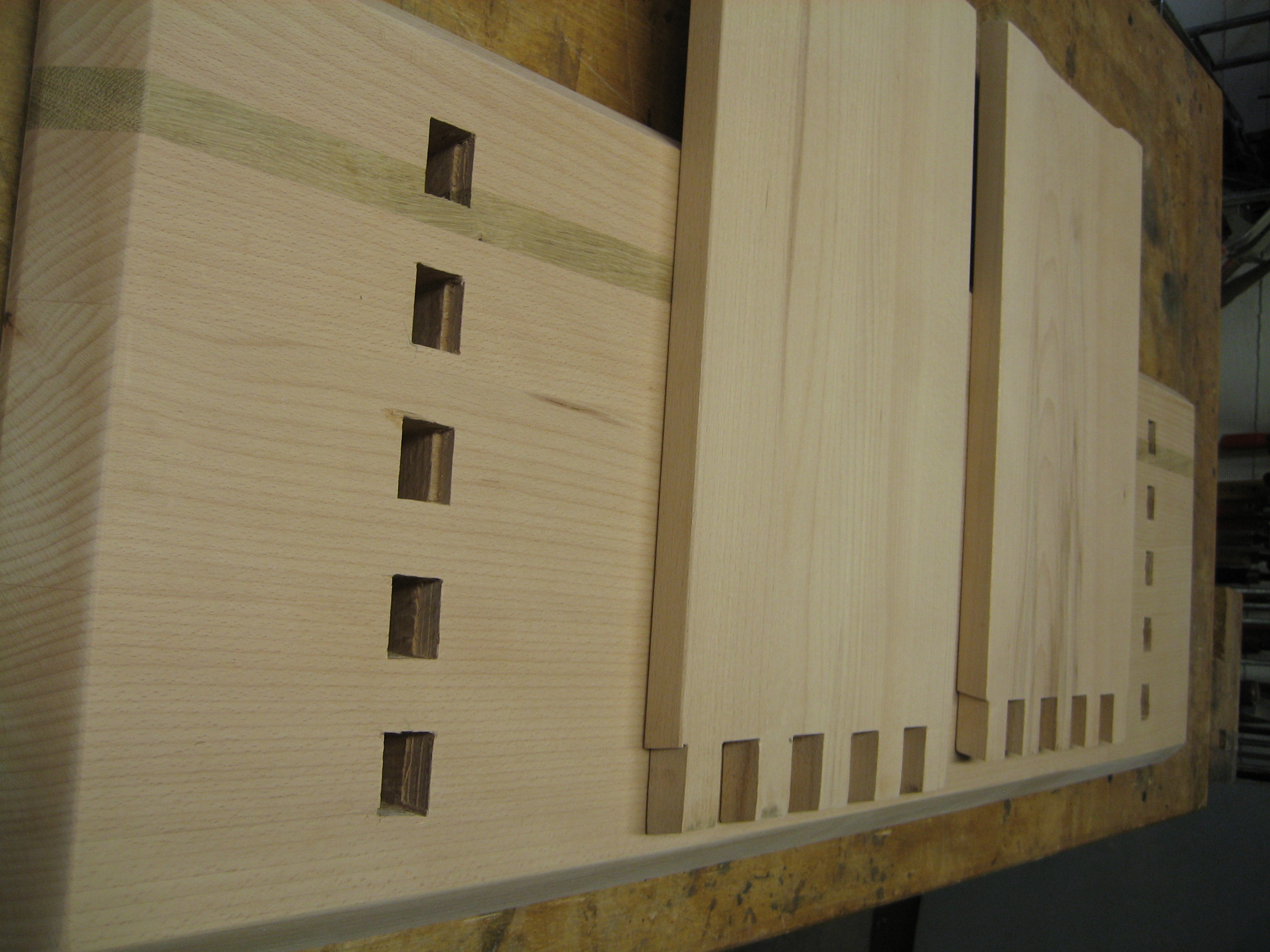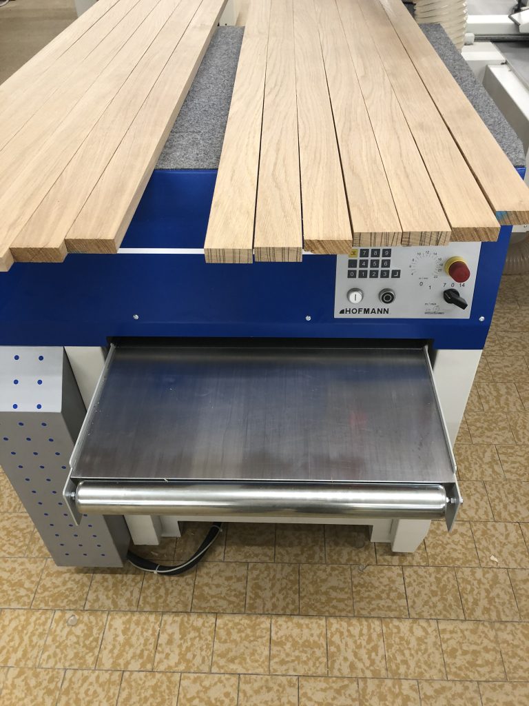 Aus Kernbuche mit einem eingeleimten Stück Eiche; Maße 1170x500x380 mm(LxHxB) und Dicke 40 bzw. 23 mm; Zinken und Zinkenlöcher mit 10 Grad-Schräge von Hand gesägt bzw. gestemmt unter Verwendung von Akagashi-Ryoba Sägen (712120) und verschiedene Oire Nomi (710137); geglättet und gefast mit Dictum Einhandhobel (703340), japanischem Schabhobel (717015), sowie Schlichthobel (703980) und verleimt mit Titebond Original (450361); geölt und gewachst; handwerklich erzeugtes Unikat.