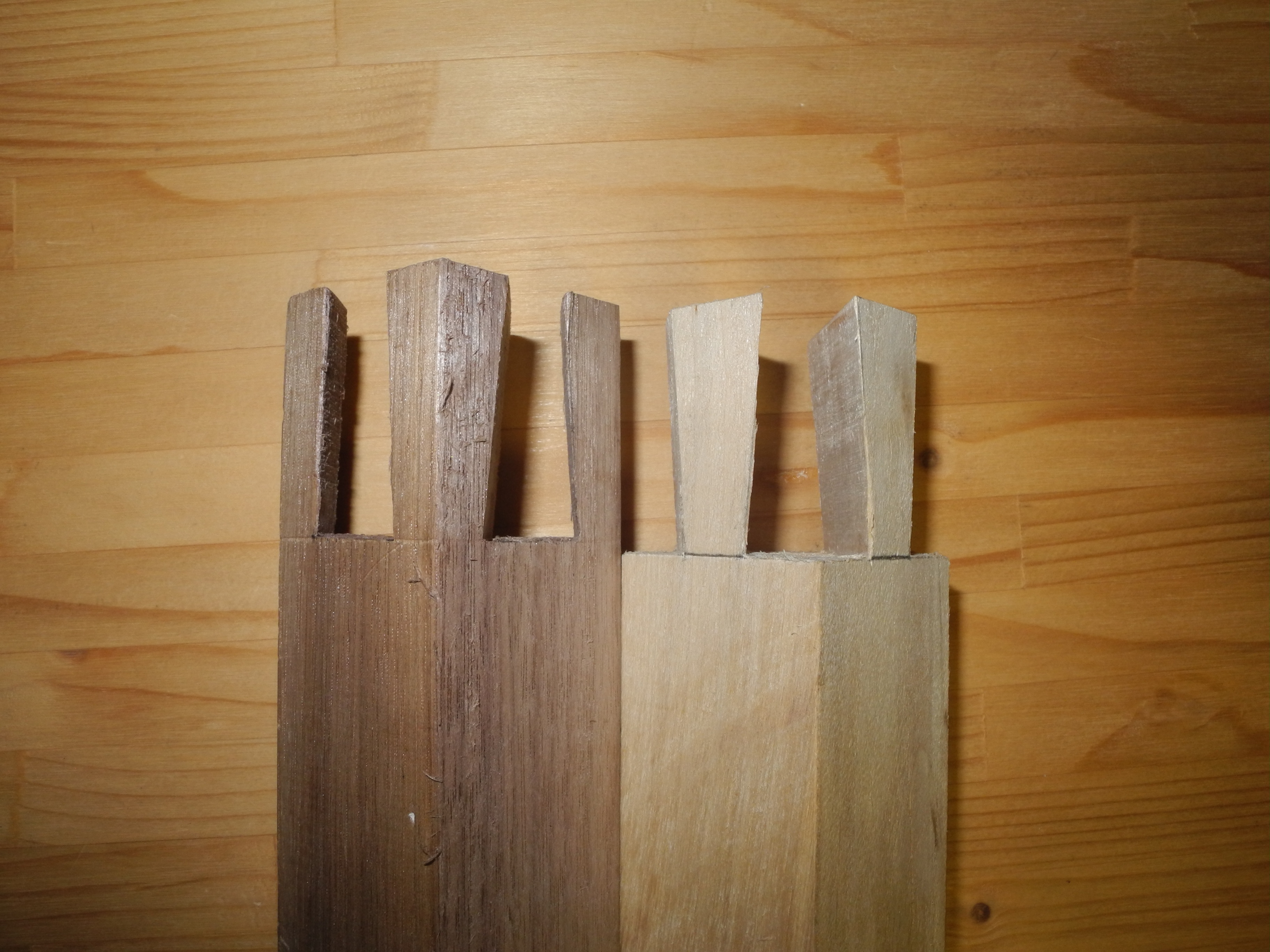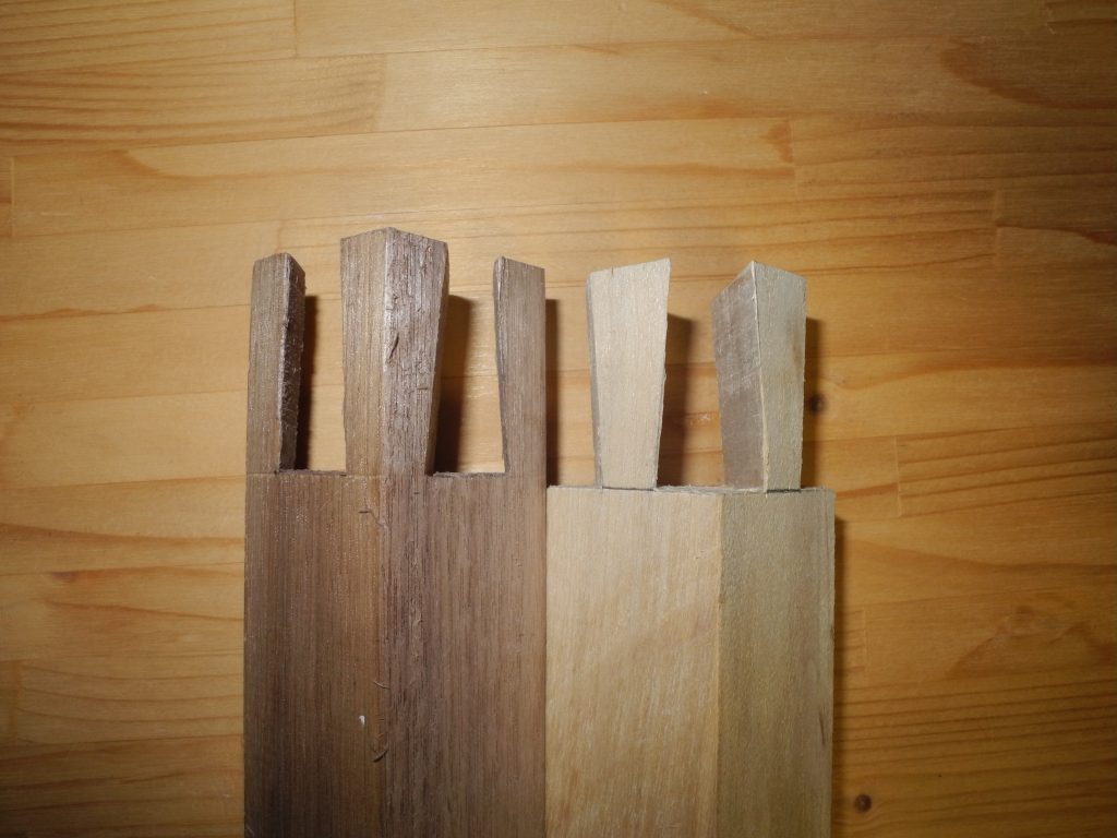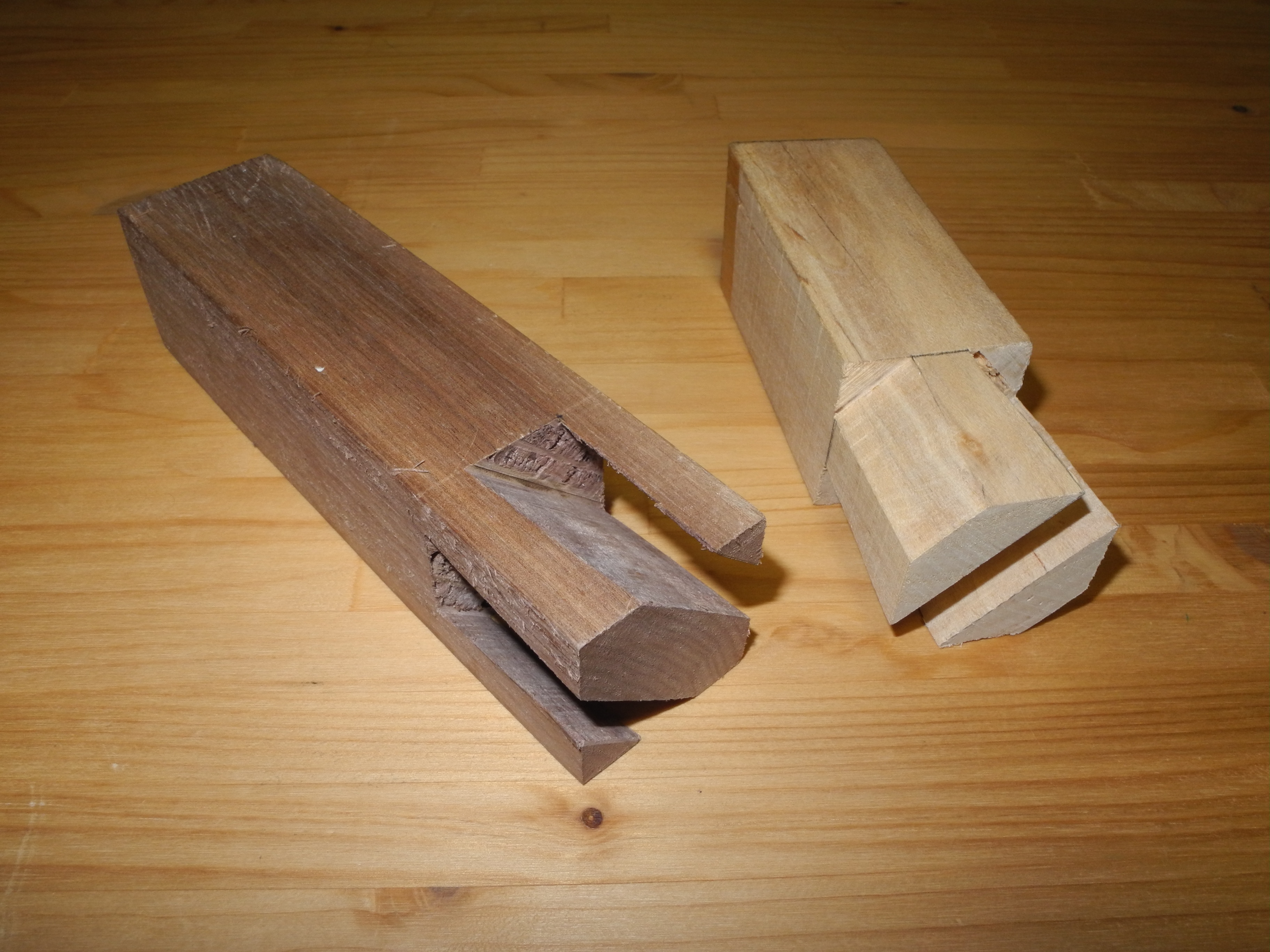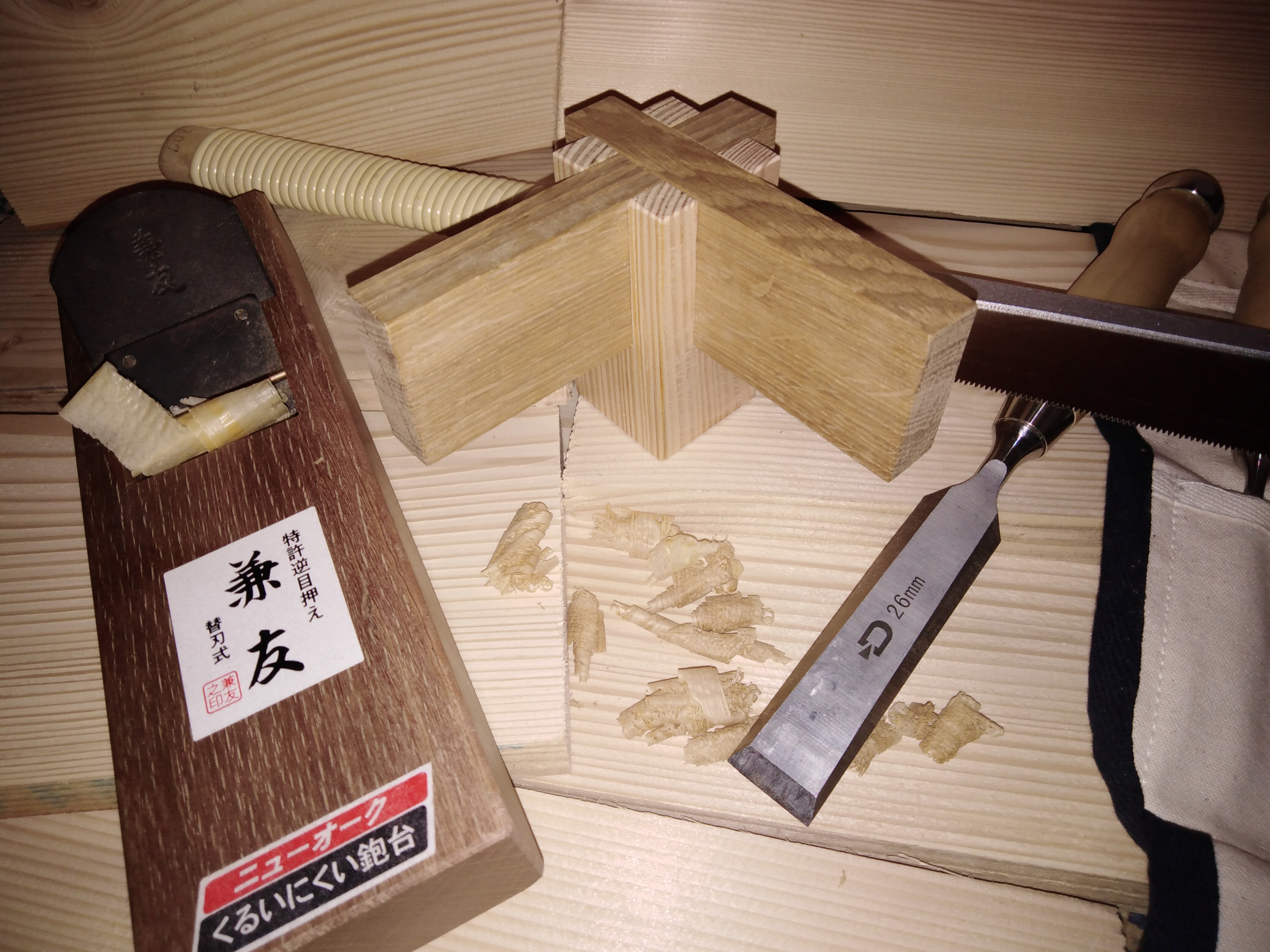 Aus Kiefer- und Eiche-Reststücken habe ich zum Ausprobieren eine einfache Eckverbindung gefertigt. Dies war das erste richtige Projekt für meine neuen Stemmeisen und den Japanhobel. Die Eckverbindung ist stabil, meines Erachtens schlicht und formschön und aufgrund der Einfachheit gut als rationelle Eckverbindung z.B. für Untergestelle von Tischen oder Bettrahmen zu verwenden.