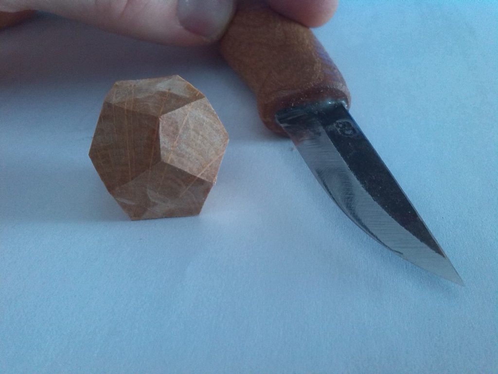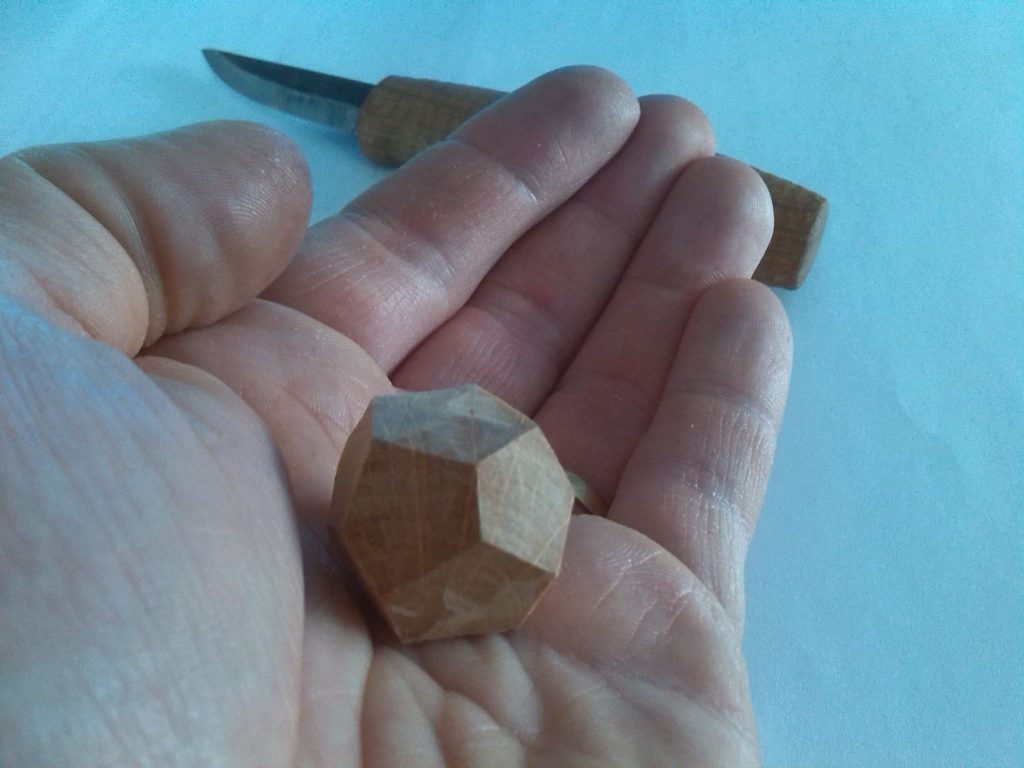 Ich habe dieses Dodekaeder aus Ulme mit dem Kinderschnitzmesser von Svante Djärv geschnitzt. Alle zwölf Flächen sind regelmäßige Fünfecke. Es war keine einfache Aufgabe, alle identisch zu machen. Das Dodekaeder ist etwa 15mm x 15mm gross.