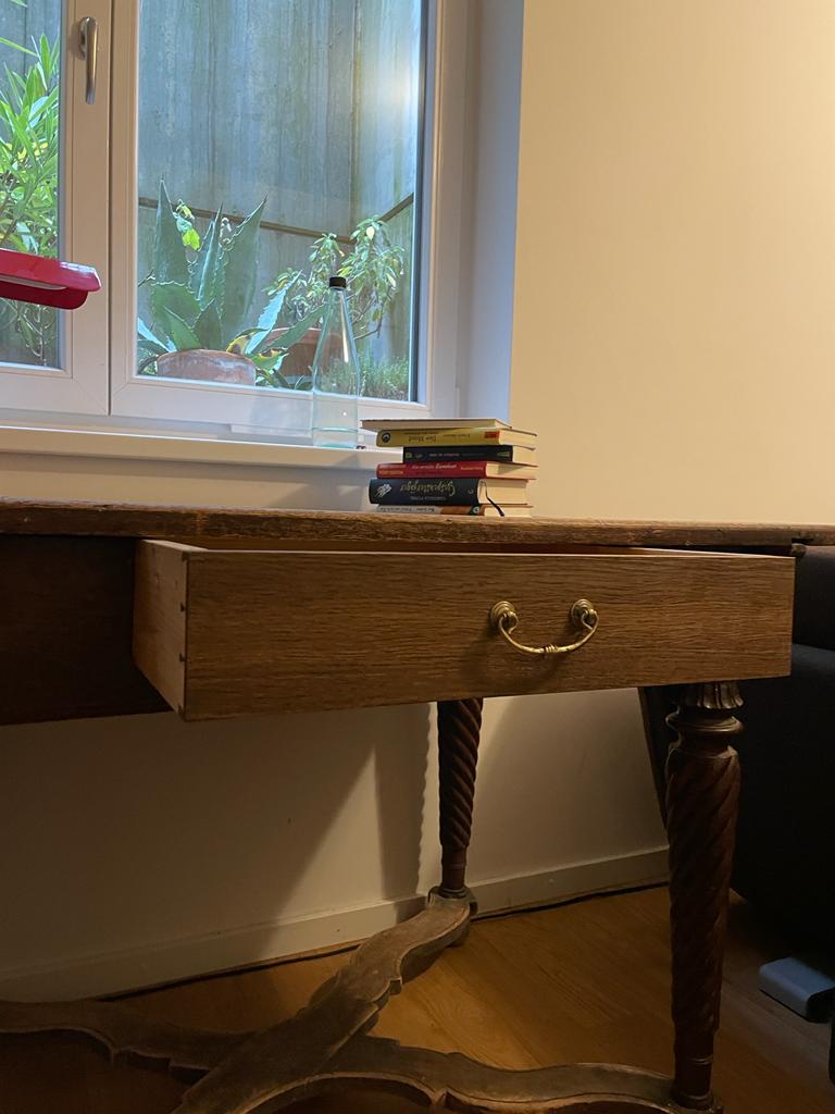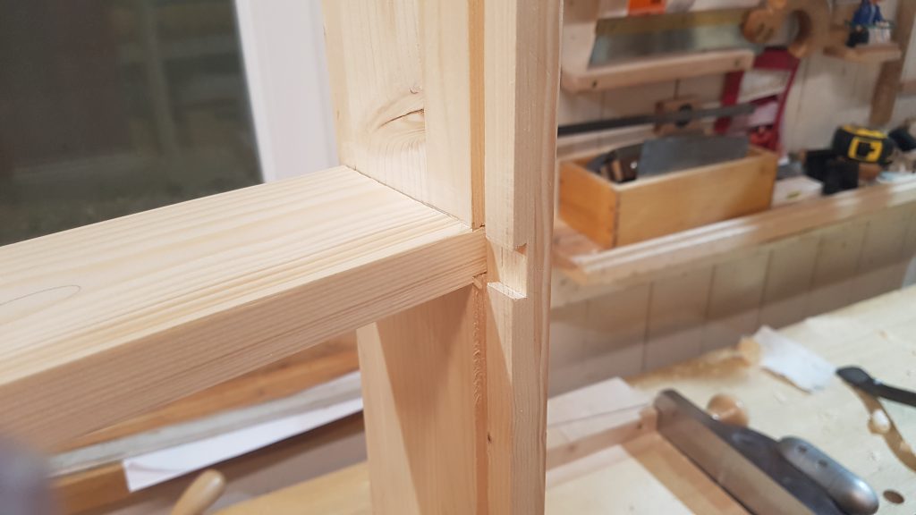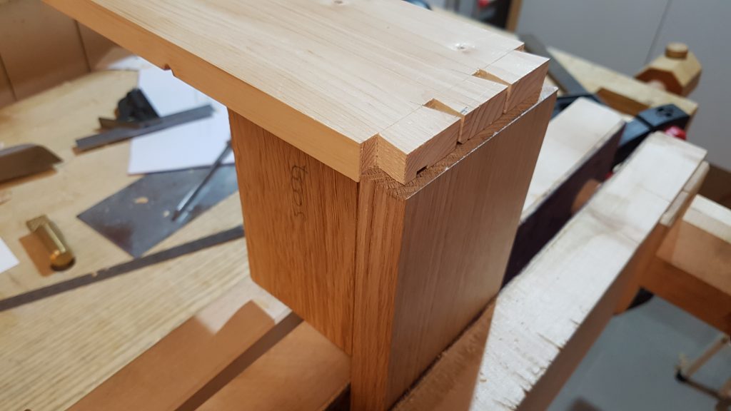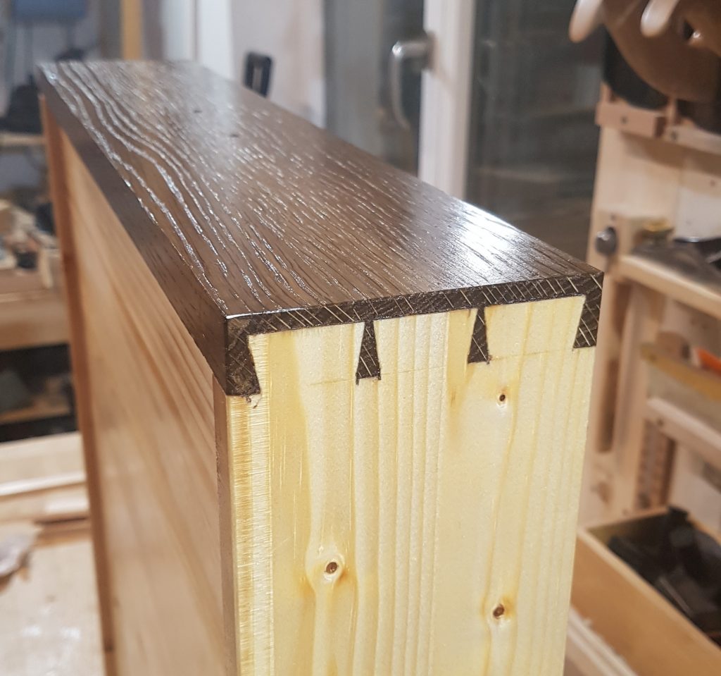 Einem alten Tisch war der Schubladen abhanden gekommen. Ich fertigte die Front für den neuen Schubladen aus Eiche, der Rest wurde aus Nadelholz hergestellt. Die Eckverbindung vorne wurde als halbverdeckte Schwalbenschwanzverbindung ausgeführt. Die vorweg erstellte Nut für den Boden und ein kleiner Falz am Schwalbenbrett erlauben es, die Teile mit einem in die Nuten gesteckten Reststück präzise aneinander auszurichten. Die Rückwand wurde nach ca. 3/4 der Gesamtlänge eingebaut, da der Bereich dahinter ohnehin schlecht zu nutzen ist. Die Rückwand wurde mit einer gestoppten Gratnutverbindung von unten in die Seitenteile geschoben und anschließend der Boden eingepasst. Die Leimverbindungen wurden mit Titebond ausgeführt. Als Werkzeuge kamen verschiedenste Hobel, Stecheisen, Handsägen, Streichmaße, Winkel und vieles andere mehr zum Einsatz. Als Oberflächenfinish wurde einmalig Leinölfirnis verwendet.
