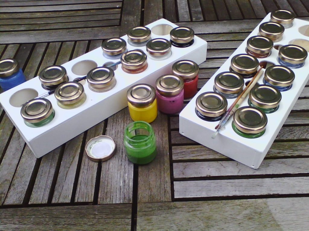 Für meine mobilen Einsätze an Schulen baute ich mir schon vor längerer Zeit kleinere Farbkästen, welche auch von den Kindern von einem Tisch zum anderen transportiert werden können. Die obere Aufnahme bohrte ich mit einer Bohrmaschine auf. Die anderen Einzelteile sägte und nutete ich an der Tischkreissäge. Die Größe wurde dabei so gewählt, dass diese Farbkästen in einen Systainer passen.