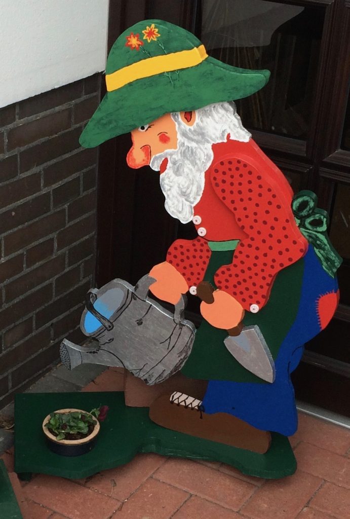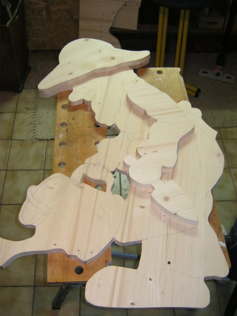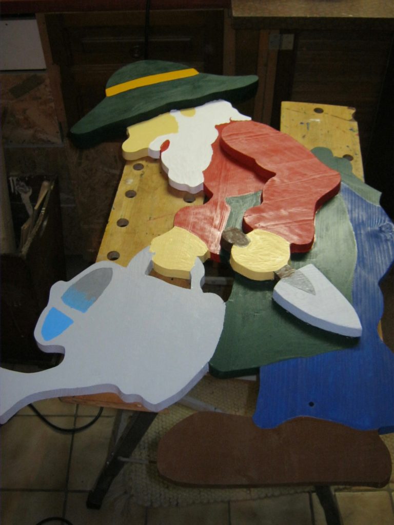 Den Gärtner haben wir auch aus einer 18mm Leimholzplatte mit Hilfe einer Stichsäge und Laubsäge ausgesägt.