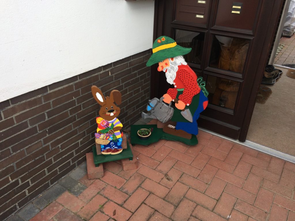 Danach wurde dieser genau wie der Osterhase von uns bemalt. Natürlich wurden die Kanten mit Schlüsselfeilen geschliffen und entgratet. Der Ständer/Grundfuß ist so befestigt, dass er zum „Überwintern“ leicht abmontierter ist. Er hat zusätzlich eine Bohrung, sodass unter der „Gießkanne“ ein Blumentopf eingesetzt werden kann und der Gärtner eine echte Blume gießen kann.