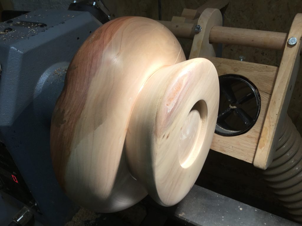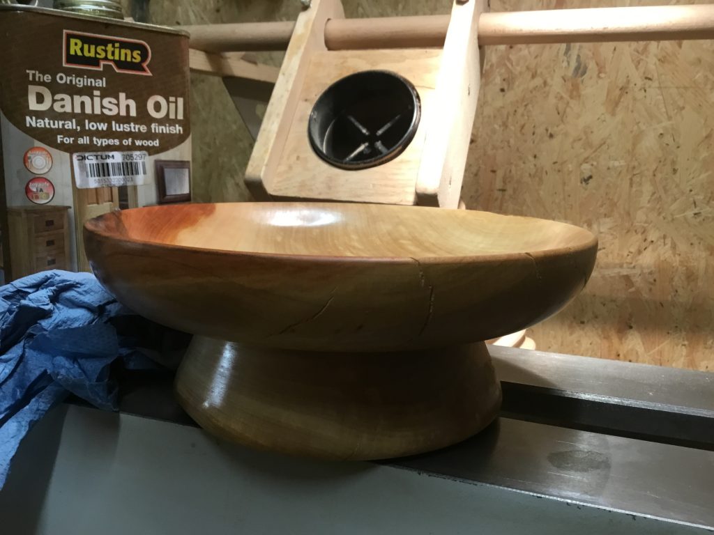 Die Schale aus dem Stamm eines Kirschbaumes hat einen Durchmesser von 23 cm und ist 9 cm hoch. Die Oberfläche wurde bis Körnung 600 geschliffen und abschließend mit Danish Oil von DICTUM behandelt.