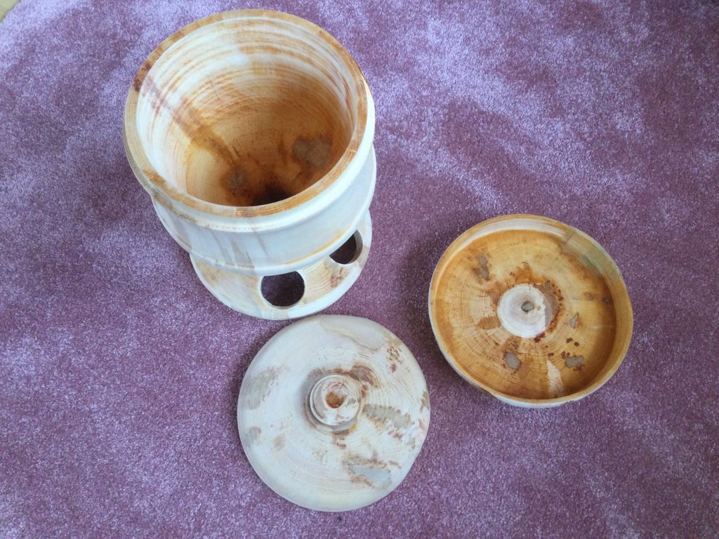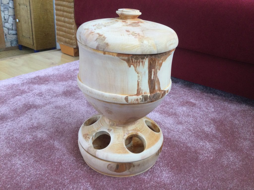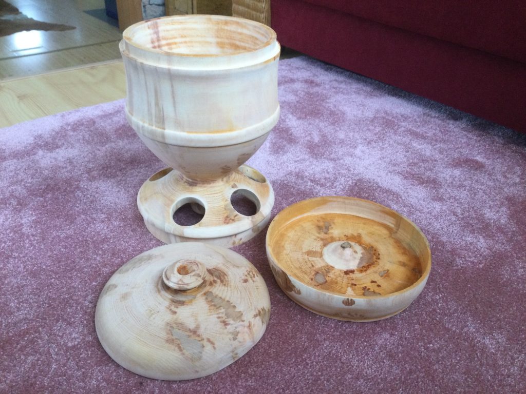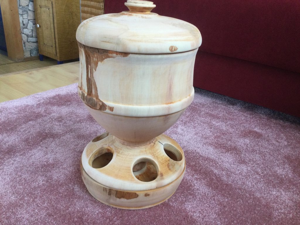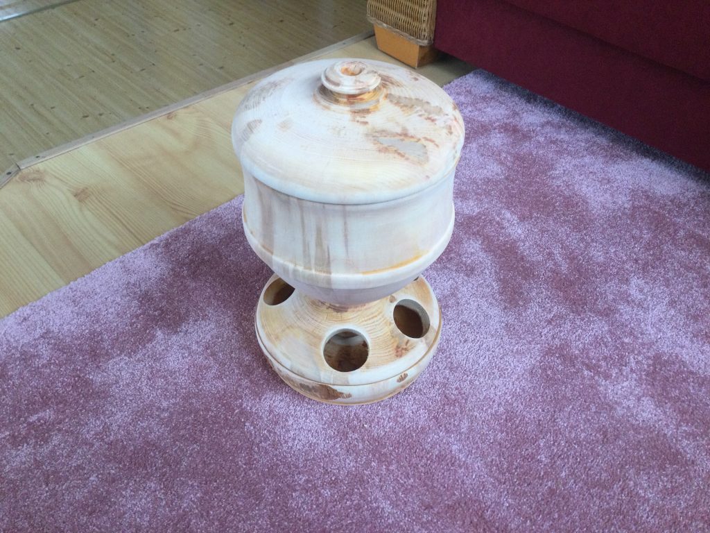 Den Futterspender habe ich aus einem Baumstamm. Er fasst ca. 5L. Der Stamm war sehr nass und schwer, deshalb habe ich ihn vorgedreht und anschließend 5 Tage in der Wohnung getrocknet. Er war danach sehr verzogen, aber um 2 kg leichter und ohne Risse. Erle eignet sich für eine solche roßkur am besten.