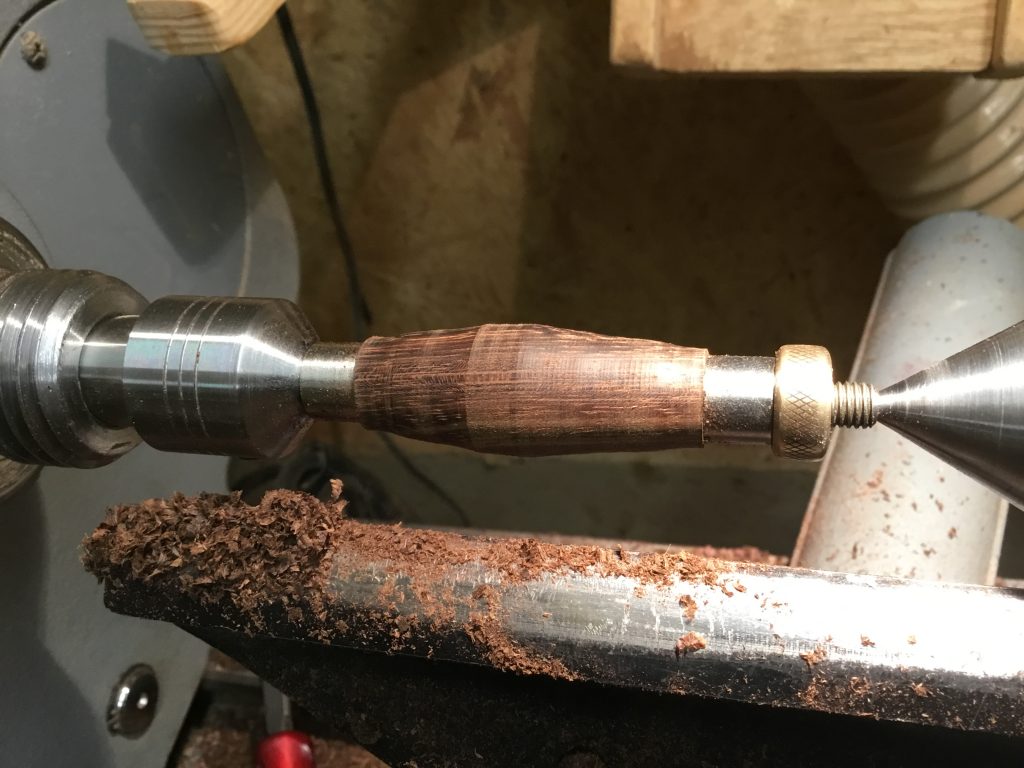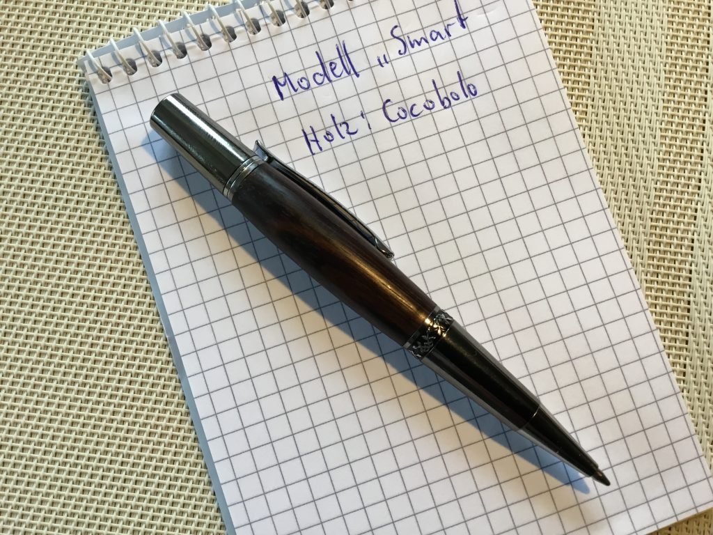 Der Kugelschreiber wurde aus cocobolo gedrechselt. Die Oberfläche wurde bis Körnung 600 geschliffen und abschließend mit Walnusswachs und Walnussöl behandelt. Bausatz Smart, Walnussöl, Walnusswachs, sowie die Kugelschreiberpresse (ideal beim Zusammenfügen des Bausatz) gibts bei Dictum!