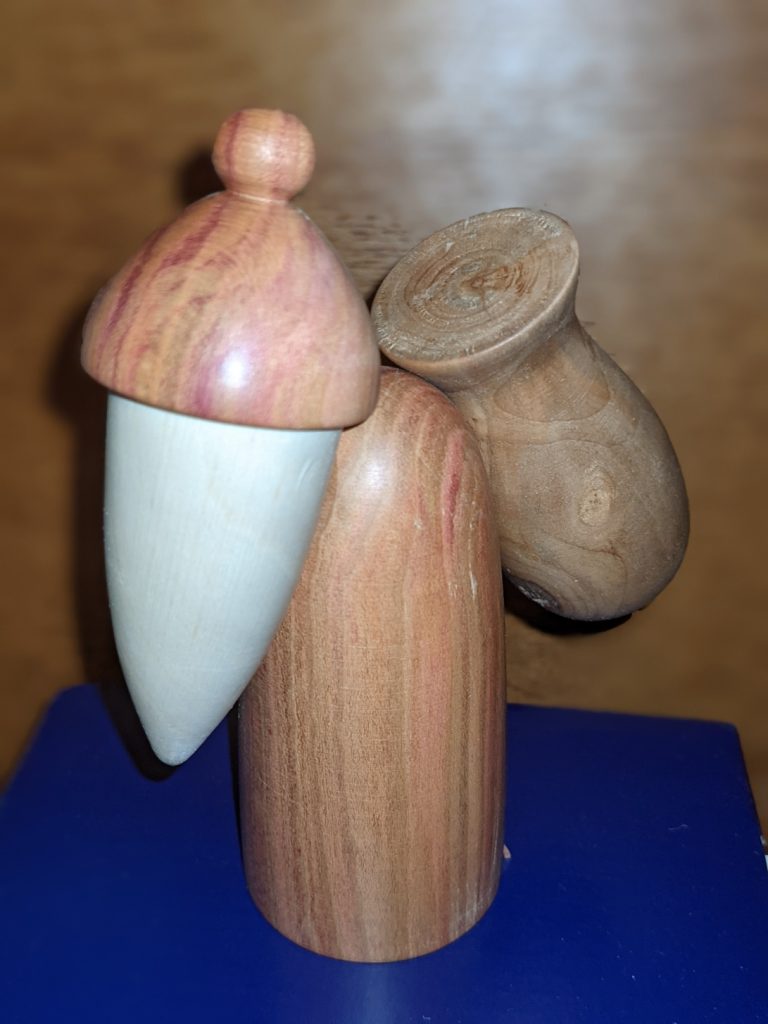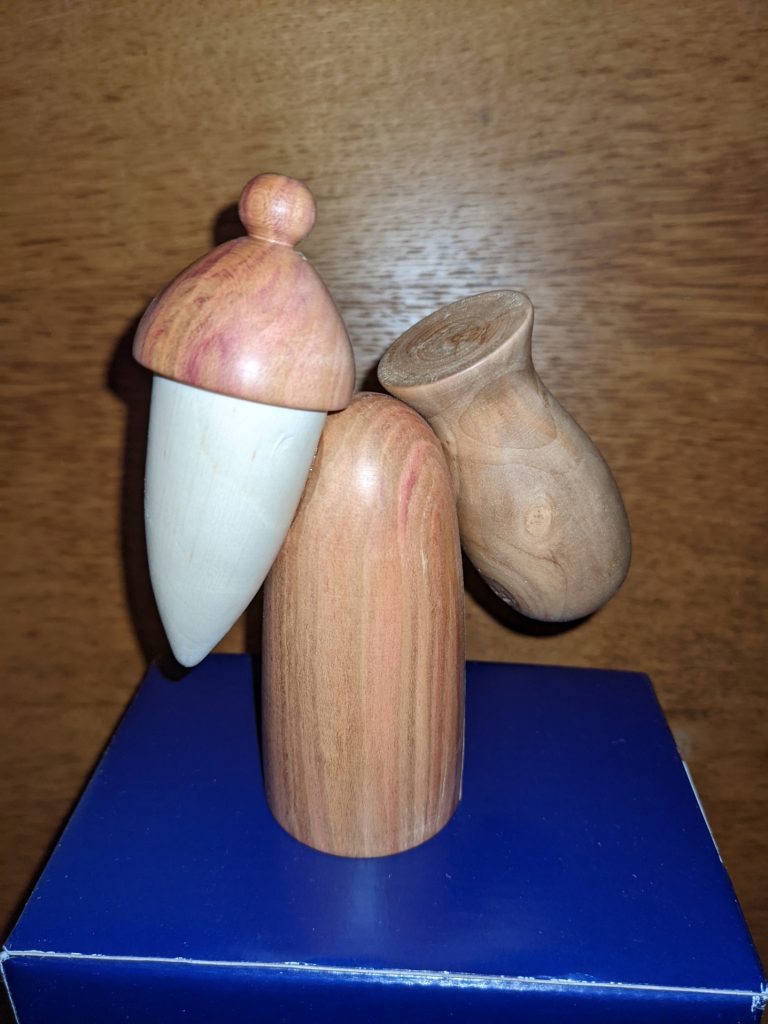 Dieser Nikolaus wurde von einem Bild im Internet inspiriert. Die Holzarten sind Zwetschge (Hut und Körper), Haselnuss (Bart) und Birne (Sack). Verbunden wurden die Teile mit Sekundenkleber und kleinen Dübeln aus einem Schaschlik-Spieß.