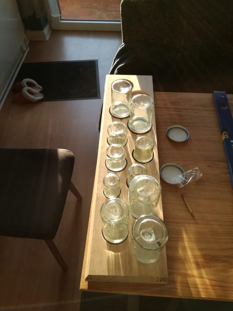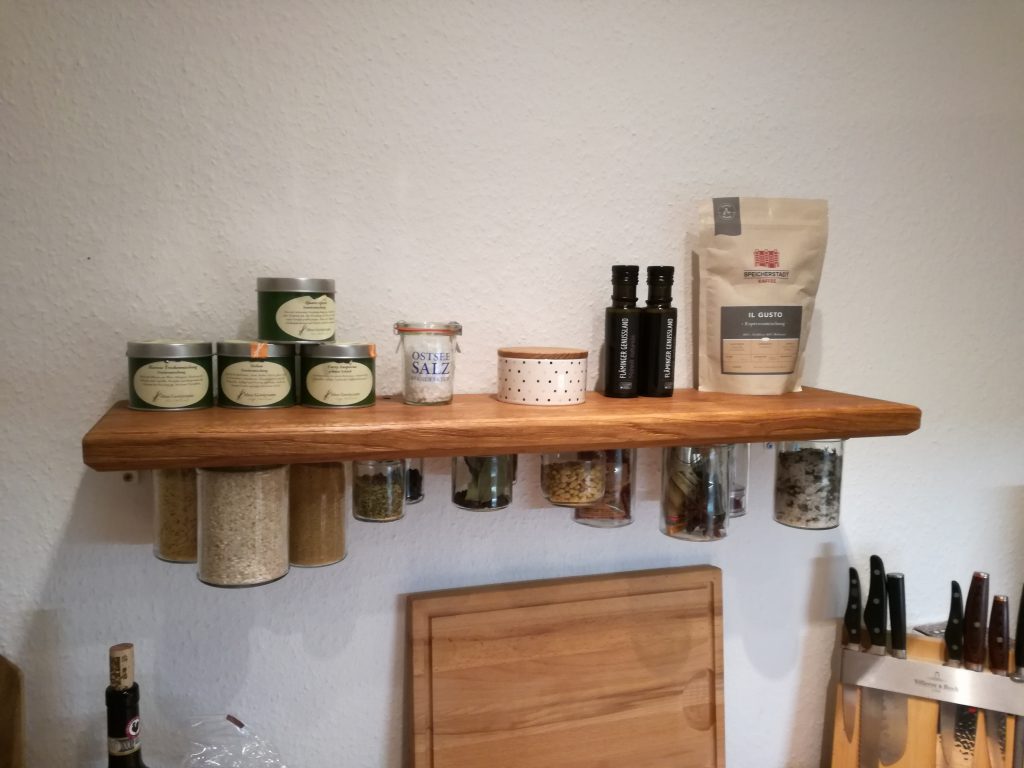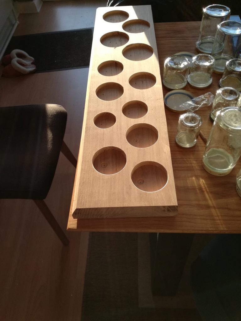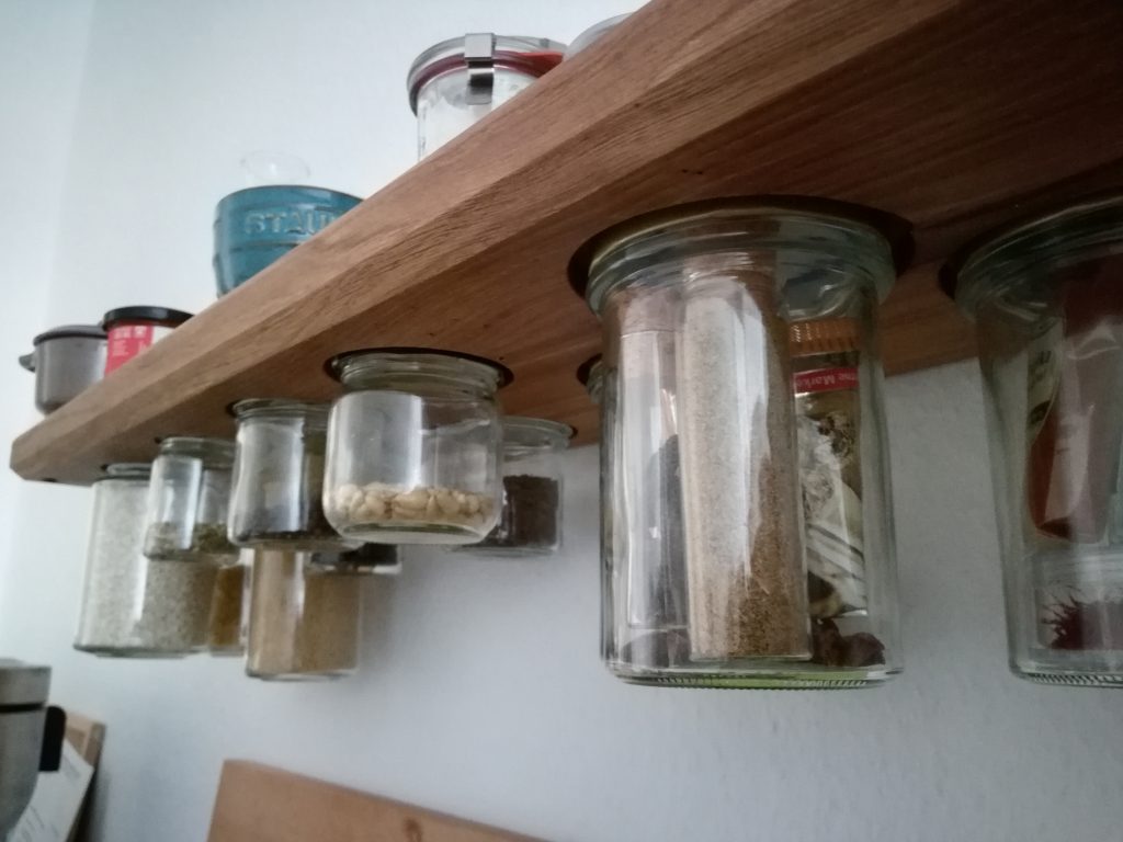 Dieses Gewürzregal besteht aus einem Eichenbrett, welches mittels Konsolen an der Wand befestigt ist. Mit der Oberfräse wurden runde Vertiefungen mit unterschiedlichen Durchmessern für alte Lebensmittelgläser eingefräst. Die Deckel der Gläser sind verschraubt.