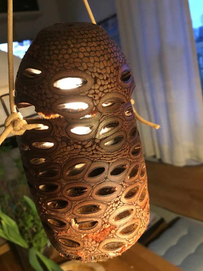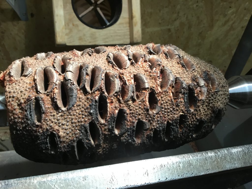 Der Banksiazapfen (Pflanzengattung der Silberbaumgewächse, heimisch in Australien und Tasmanien) wurde hier als Deko-Leuchtmittelumfunktioniert. Nach dem Drechseln wurde die Oberfläche bis Körnung 400 geschliffen und zum Schluss mit Nussöl ( gibts bei Dictum!👍) behandelt.