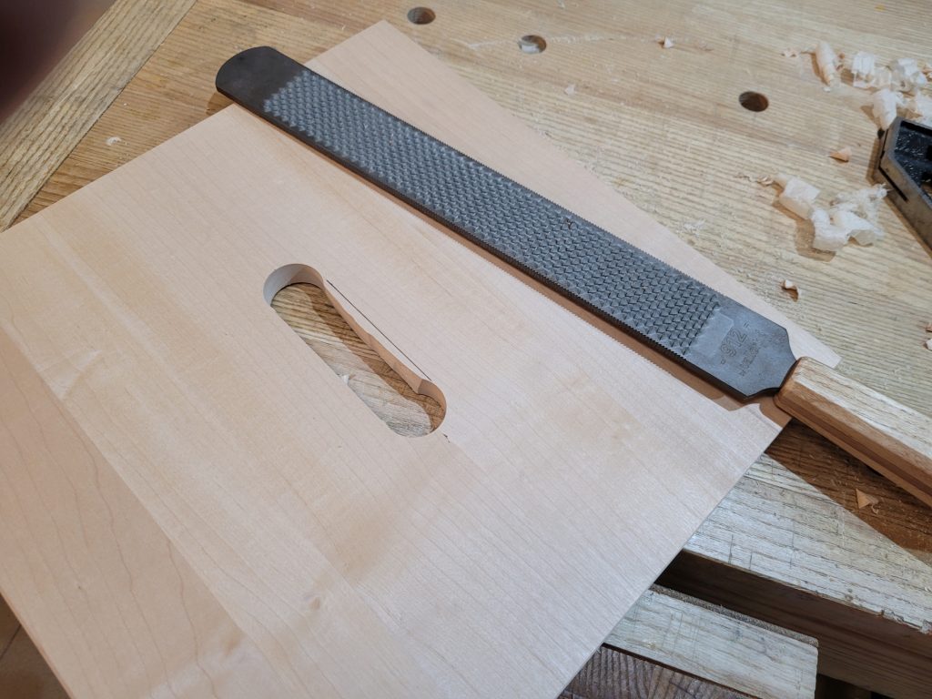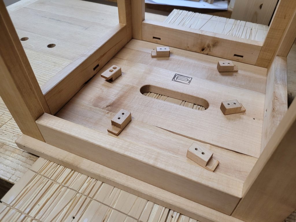 Alle Teile wurden aus massivem Ahorn hergestellt. Die Beine fertigte aus Leisten, die abgeschrägt und L-förmig verleimt wurden. Die Verbindungen der Zargen mit den Beinen konnte ich mit einer Festool Domino 500 ausführen. Die Sitzfläche erhielt ein Griffloch, das mit einem Fisch Forstner-Bohrer vorgebohrt wurde, mit einer Hufraspel erweitert und anschließend mit Stemmeisen ausgearbeitet wurde.