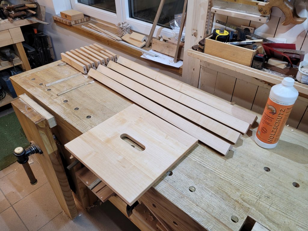 Alle Holzteile wurden mit Pegma Color »Holz-Sunblocker« behandelt, um ein Nachdunkeln des Holzes möglichst lange zu verzögern. Für die Oberflächenbehandlung wählte ich Mohnöl, um die helle Farbe des Ahornholzes zu erhalten.