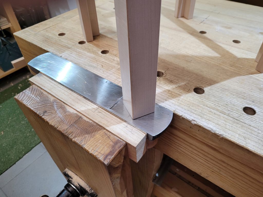 Ich befestigte sie mit kleinen ausgeklinkten Holzklötzchen am Gestell, so dass ein Schwinden und Quellen ohne Schäden möglich ist. Die Beine wurden in der Länge mit einem Dictum Flachwinkelhobel genau angepasst. Dieser wurde dazu in der Vorderzange eingespannt.