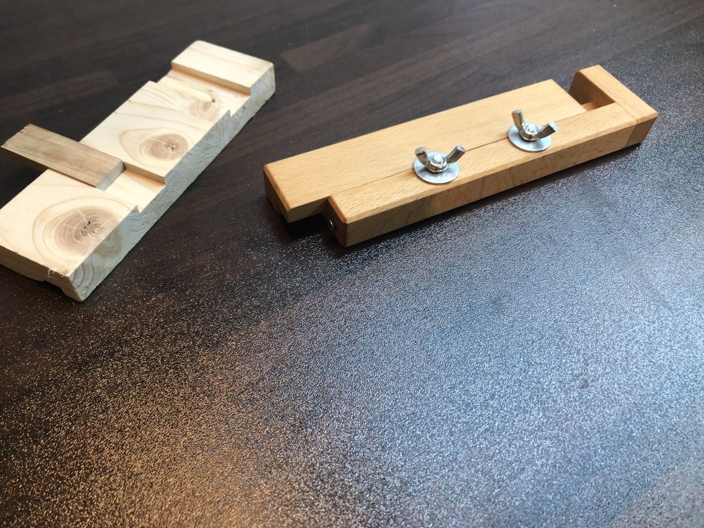 Die Schnittfugen-Hilfe, oder auch Schlitz- und Nuten-Einstelllehre genannt, besteht aus Buchenholz und wird mit zwei Flügelmuttern verstellt. Über eine stirnseitige Stellschraube lässt sie sich individuell auf die Sägeblattbreite einstellen. Die Sägearbeiten erfolgten mit dem Festool CMS-TS 55 R-Set, die Fräsarbeiten mit der Festool OF 1400 EBQ.