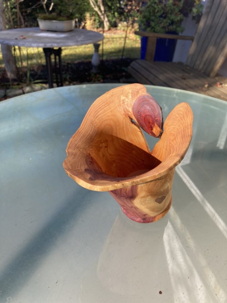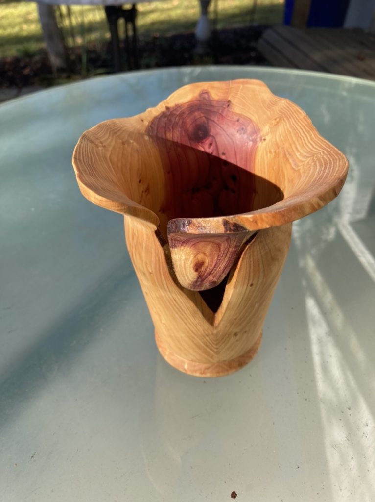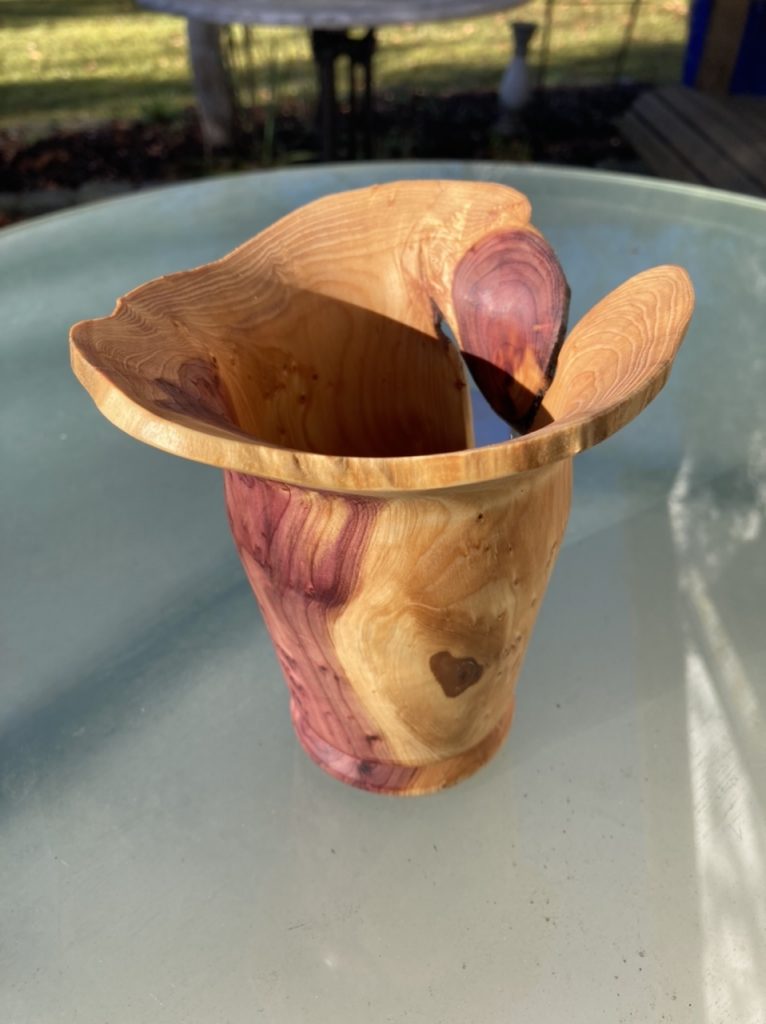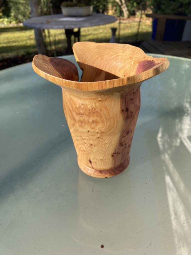 Ich hatte das Glück von Privat einige tolle und auch z.T. beachtlich große Stücke Wacholderholz zu bekommen. Hier eine daraus gedrechselte Vase. Wie zur Zeit fast immer mit Naturrand und geölt (Leinöl und Danish Oil). Größe ca. 13cm Durchmesser ca. 8cm.