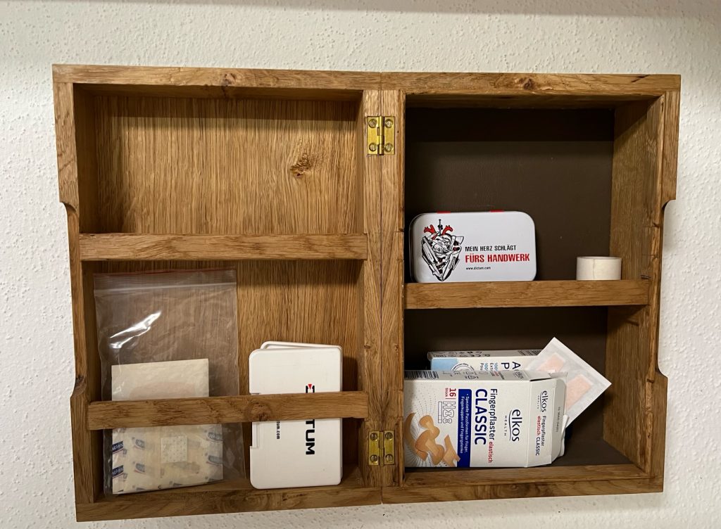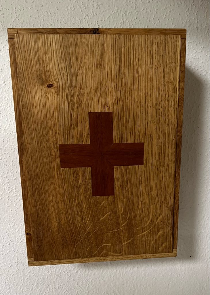 Aus Reststücken Eiche und etwas Mahagoni Furnier entstand dieser kleine Schrank für Verbandsmaterialien (u.a. bestückt mit den Dictum Pflastern), Die Rückwand ist mit Leder bezogen, die Borde sind mit Halteleisten versehen (an die ich natürlich bei der Dichtlippe zu spät gedacht habe). Ziel war es auch, mal eine einfache Einlegearbeit mit dem Mahagoni-roten Kreuz auszuprobieren). Oberflächenbehandlung mit Danish-Oil.