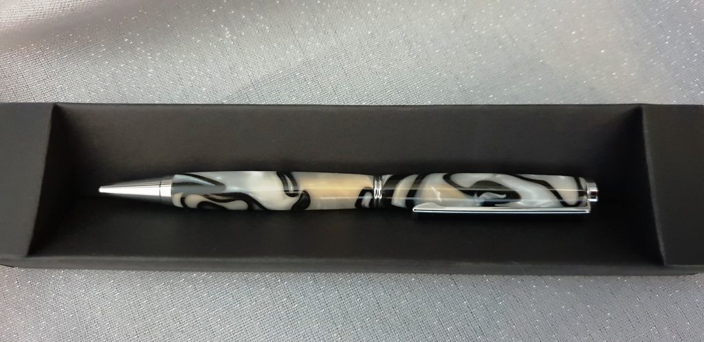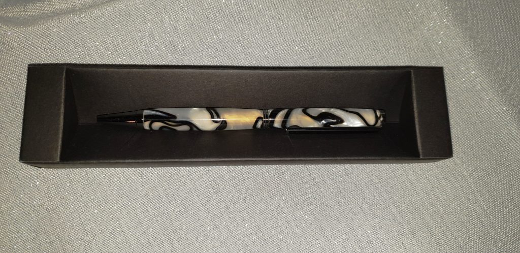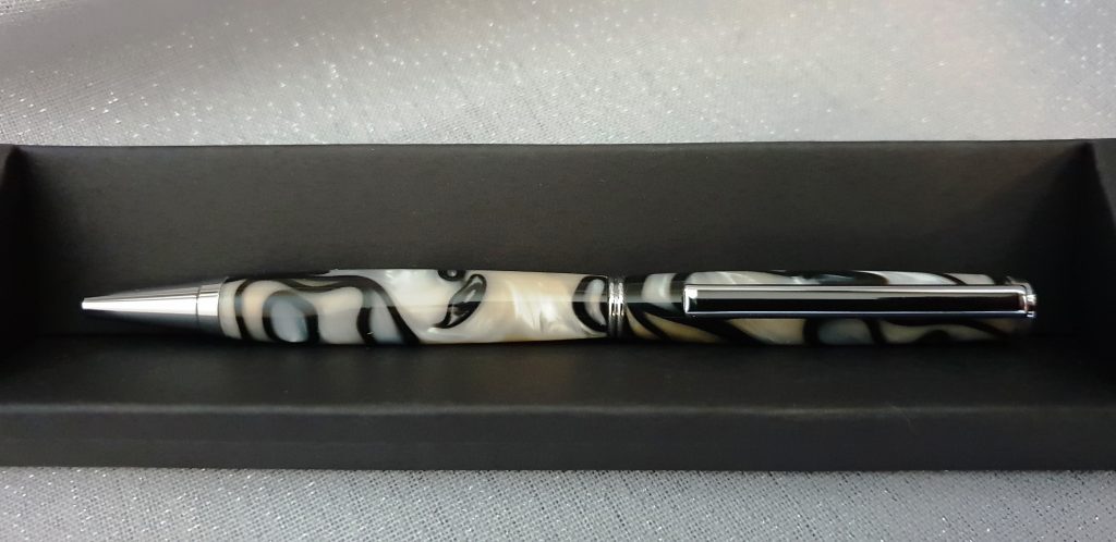 Der Kugelschreiber Paris von DICTUM ist aus Acryl gedrechselt und sind verchromt. Die Penblanks sind ebenfalls von DICTUM. Acryl ist kratz-unempfindlich, witterungs- und alterungsbeständig. Auch Säuren und Laugen mittlerer Konzentration können dem Material nichts anhaben. Das schöne an diesem Material ist eine wunderbare changierende Oberfläche, die durch den sorgfältigen und aufwendigen Nassschliff zum Vorschein kommt. Auch diese hochwertigen Kugelschreiber haben einen bruchfesten Clip, sowie eine Mine mit Wolframcarbid-Kugel und Tinte auf Ölbasis. Material: Acryl – Ausführung Perlmutt/schwarz Oberfläche: Nassschliff mit 16 Arbeitsschritten von 400er bis 12000er Korn, danach mehrfach mit Politur behandelt.