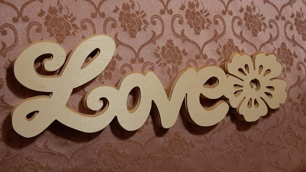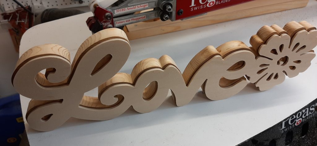 „Love-mit Blüte“ wurde aus Kiefer Leimholz & Sperrholz Birke an der Dekupiersäge nach handschriftlicher Skizze und mit Versatz als Raumdekoration ausgesägt.