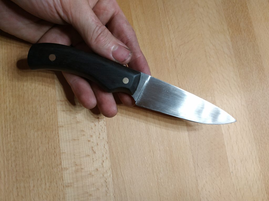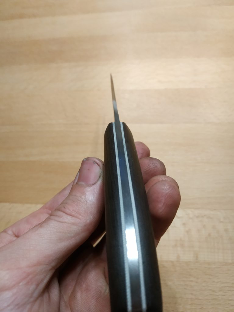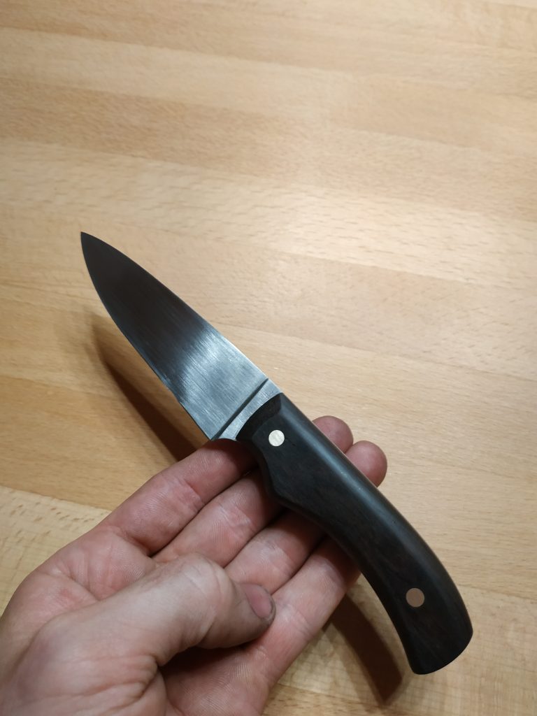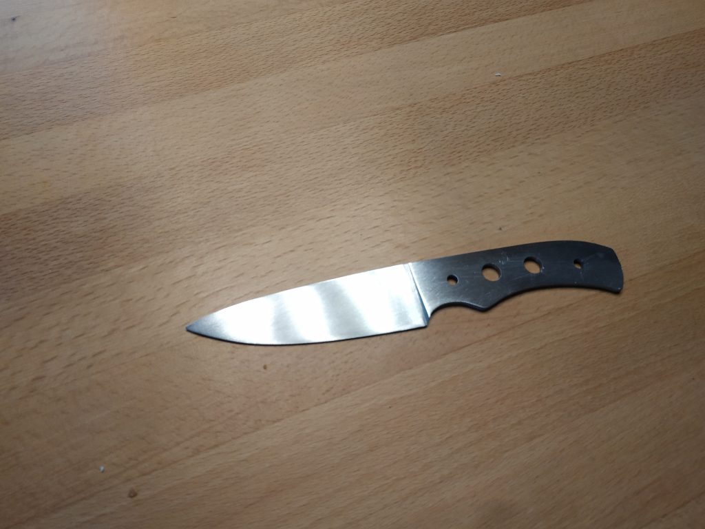 Den leichten Verzug der sich dabei ergeben hat konnte ich noch großteils korrigieren während die Klinge noch warm war. Danach wurde sie bei 240° im Ofen angelassen und bis Körnung 600 geschliffen.