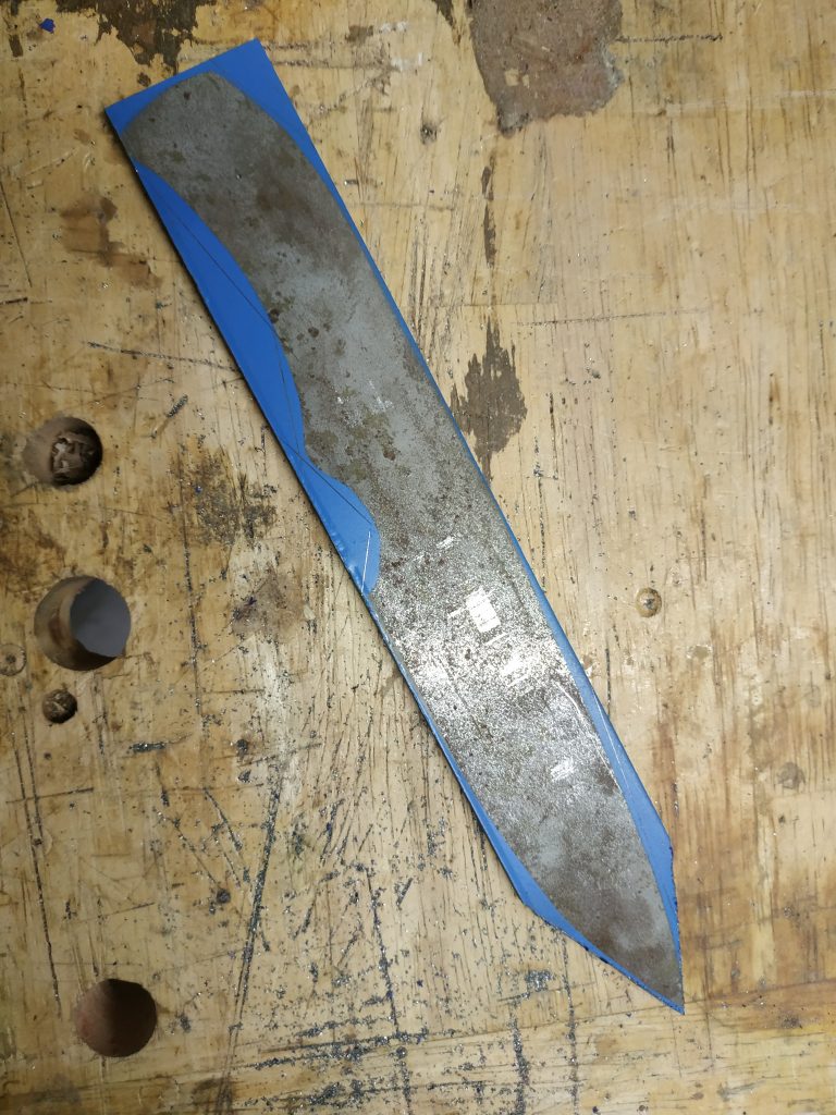 Nachdem ich zwar schon viele Messergriffe aber noch keine Klinge selbst gemacht habe, wurde es auch Mal Zeit dieses Projekt anzugehen. Aus einem Stück 80CrV2 Flachstahl habe ich die Form des Messers mit einer Bügelsäge ausgesägt und dann zurecht gefeilt.
