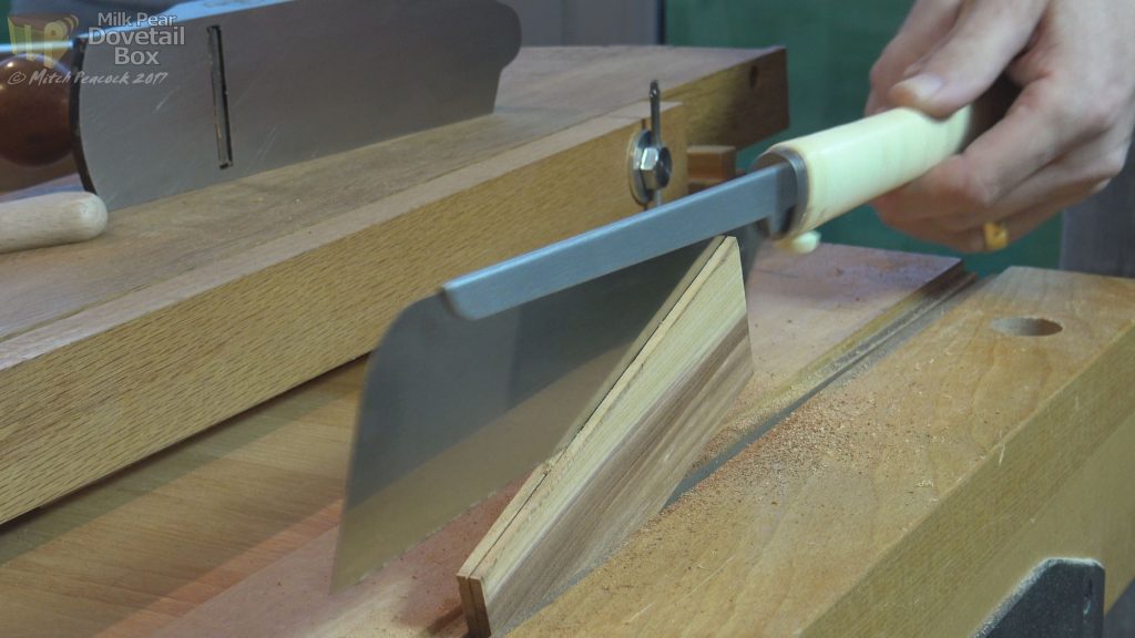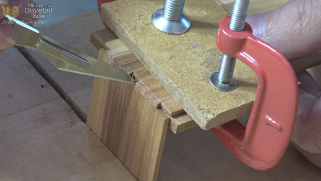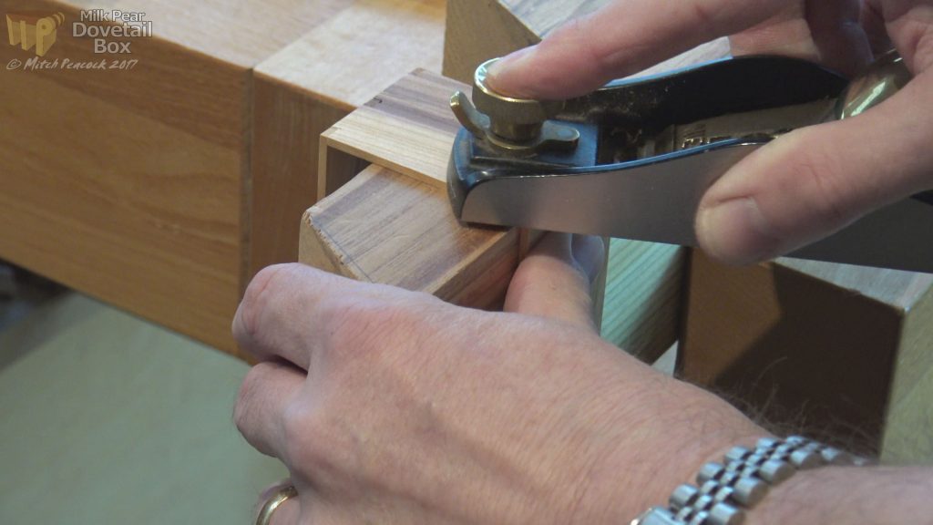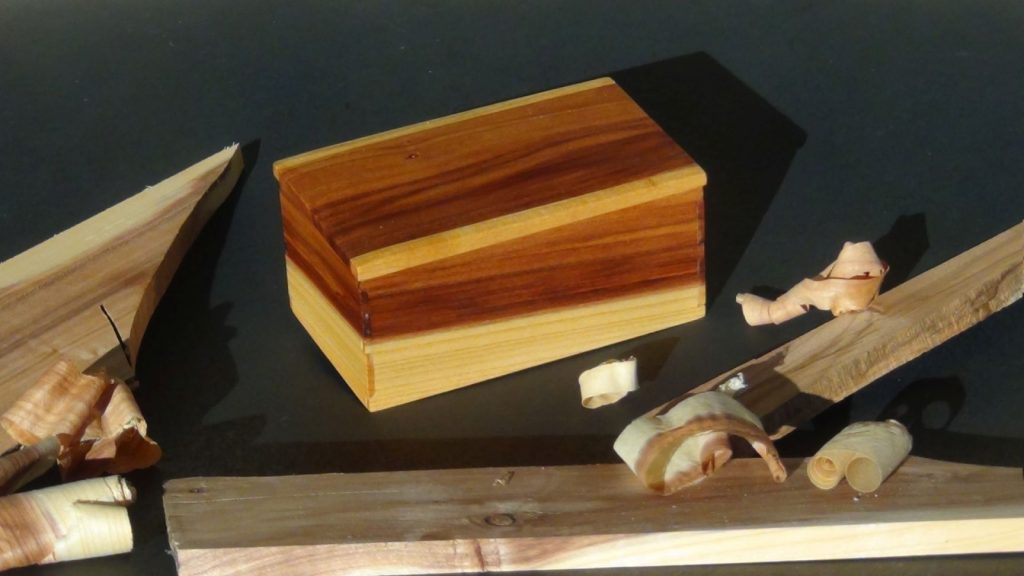 Für diese kleine Box hobelte ich Abfallstücke von Milchbirnen-Holz und trennte sie in 4 mm dicke Brettchen auf. Diese wurden anschließend auf Maß gesägt, glatt gehobelt und Schwalbenschwänze ausgearbeitet. Als Boden leimte ich ein 4 mm starkes Stück Sperrholz ein. Für den Deckel wurde ein dickeres Stück Milchbirnenholz mit einem umlaufenden Falz versehen, der exakt in das Kästchen passt. Als Oberflächenfinish wurde Tungöl aufgebracht.