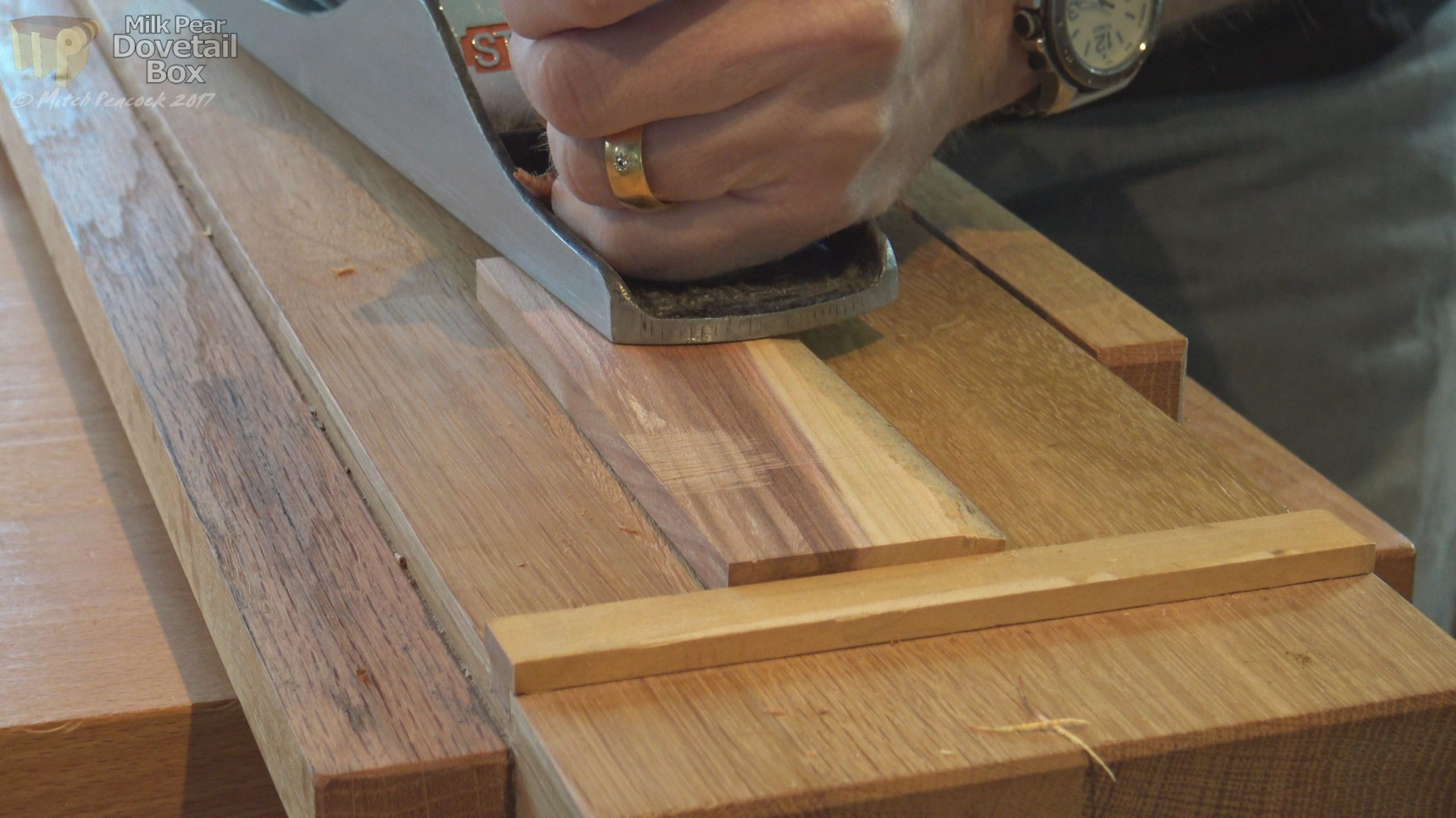 Für diese kleine Box hobelte ich Abfallstücke von Milchbirnen-Holz und trennte sie in 4 mm dicke Brettchen auf. Diese wurden anschließend auf Maß gesägt, glatt gehobelt und Schwalbenschwänze ausgearbeitet. Als Boden leimte ich ein 4 mm starkes Stück Sperrholz ein. Für den Deckel wurde ein dickeres Stück Milchbirnenholz mit einem umlaufenden Falz versehen, der exakt in das Kästchen passt. Als Oberflächenfinish wurde Tungöl aufgebracht.