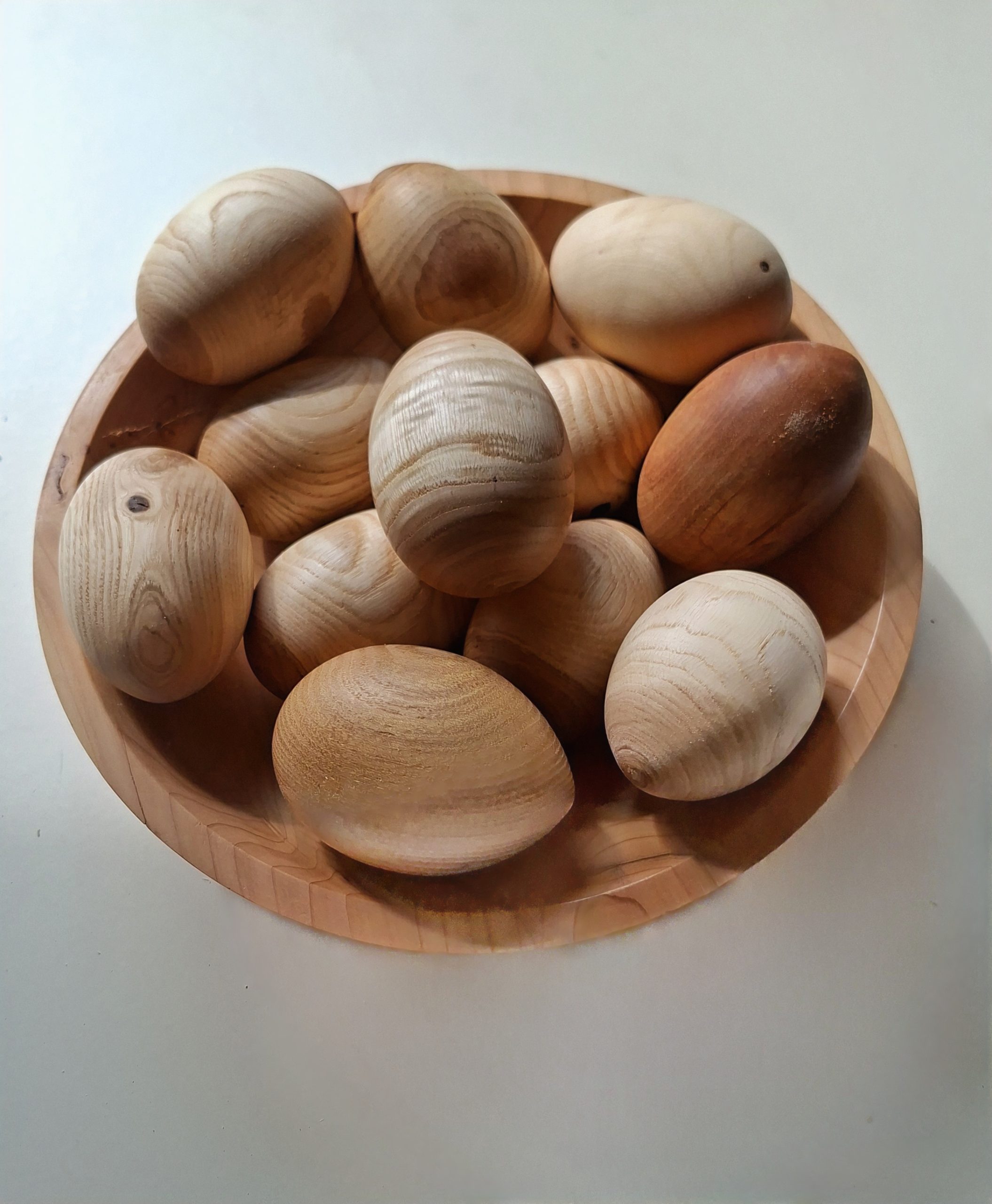 Ostereier aus Marone , Kirschlorbeer und Robinie . Geschliffen bis Körnung 400 und 2 x mit