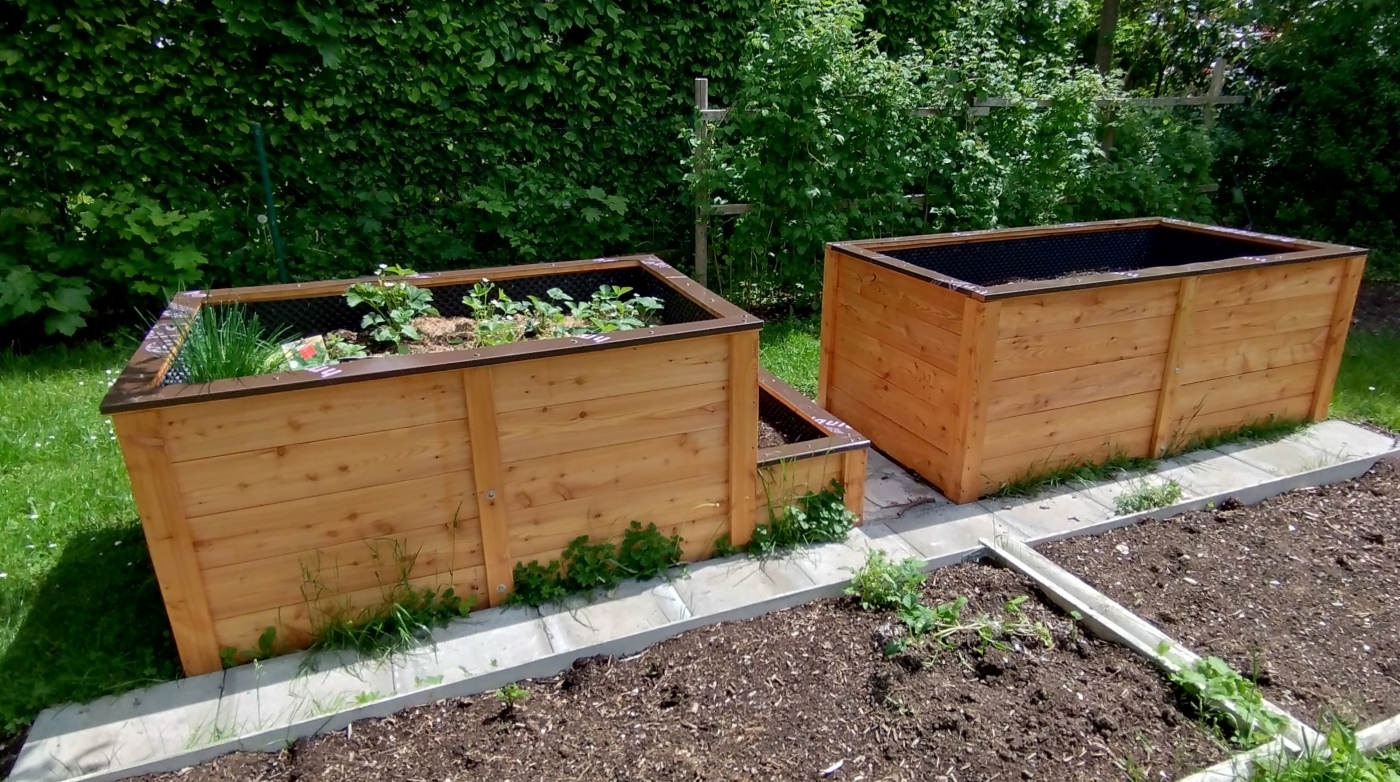 Hochbeete aus Lärchenholz. 200 x 100 x 75 cm. Auf die Randleisten habe ich als Wetterschutz Aluminiumwinkel aufgebracht.