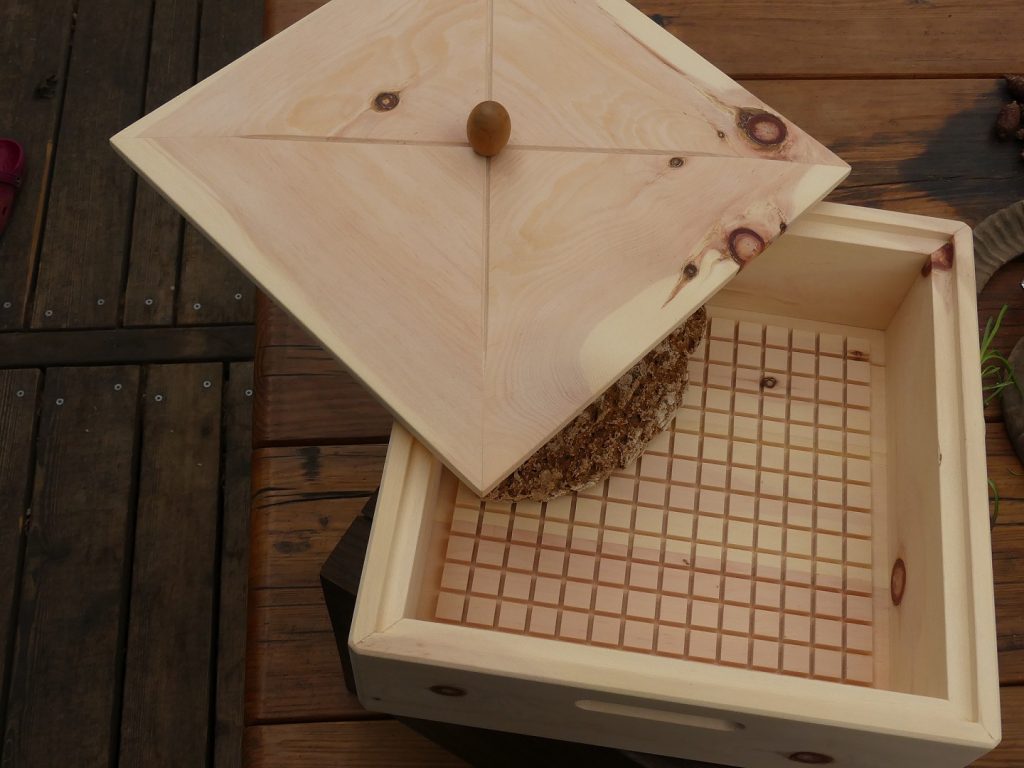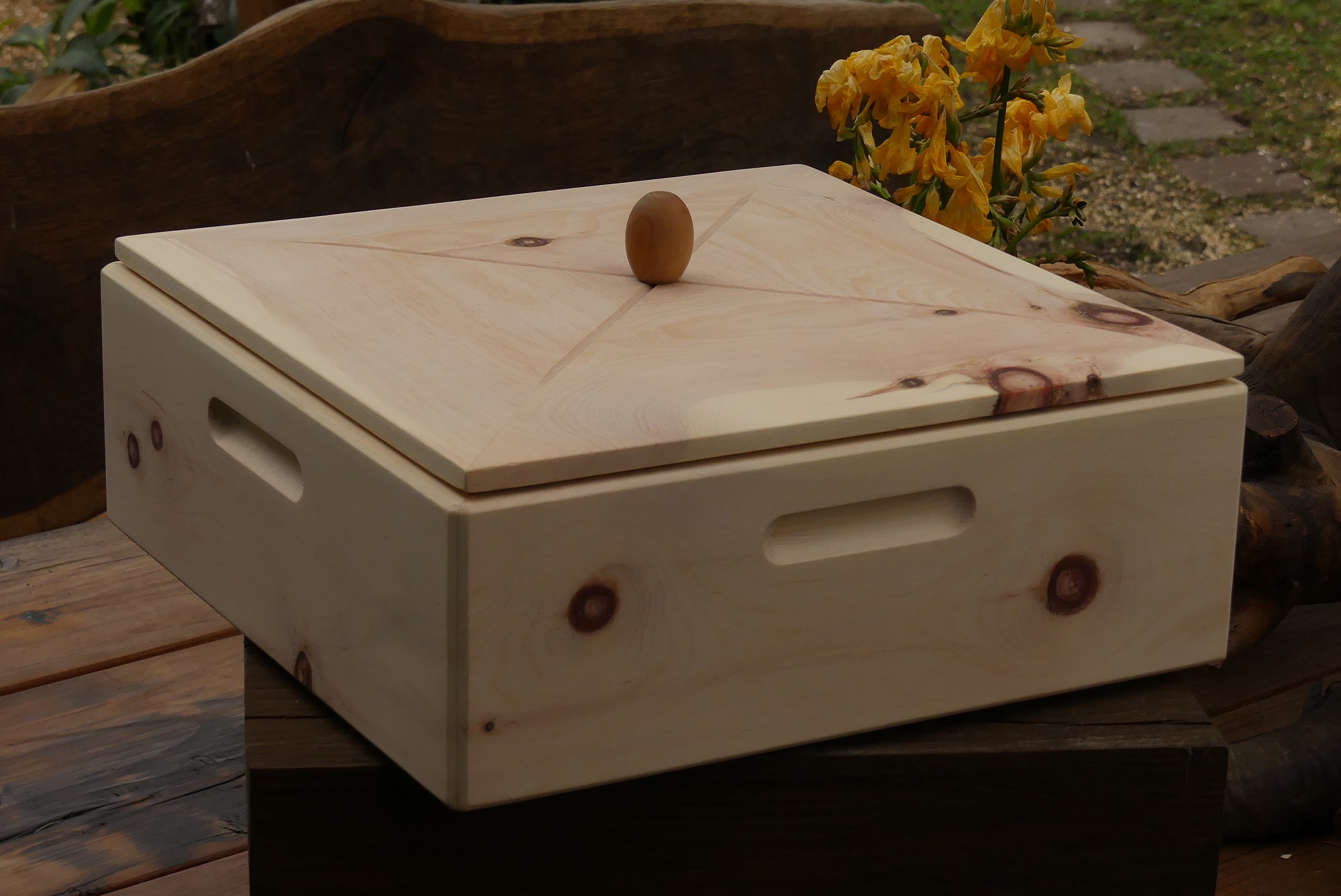Dose aus Thuja-Wurzel mit Deckel aus Goldregen . Der Griff ist ein