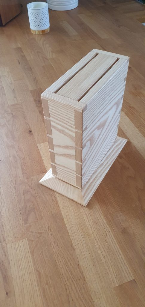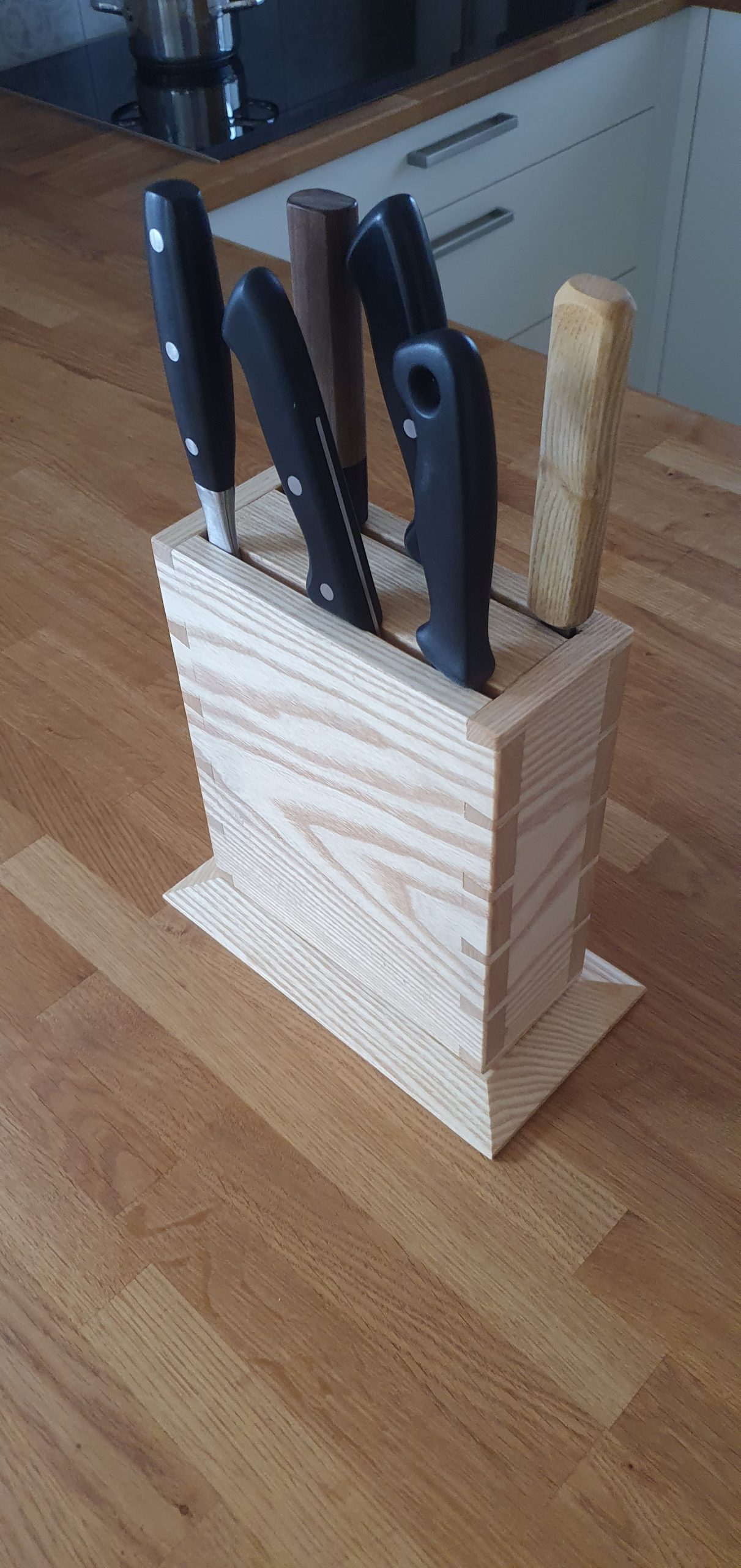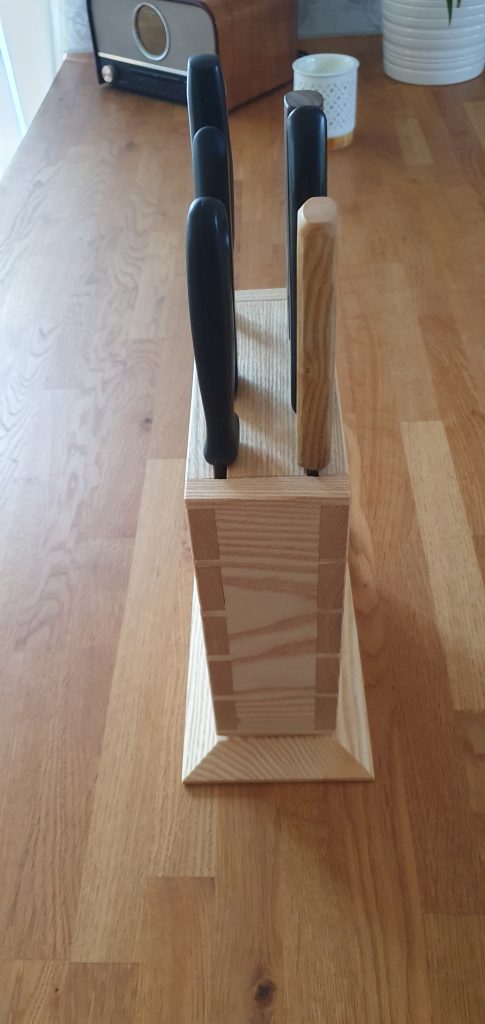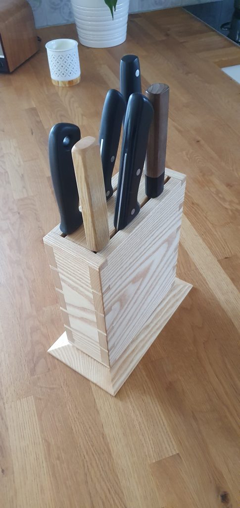 Der Korpus des Messerblocks aus massiver Esche wurde mit Hilfe von Schwalbenschwänzen ringsum verbunden.