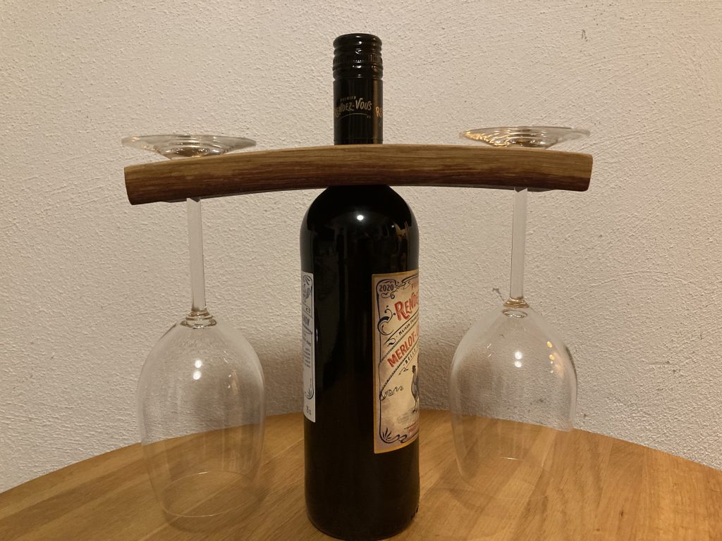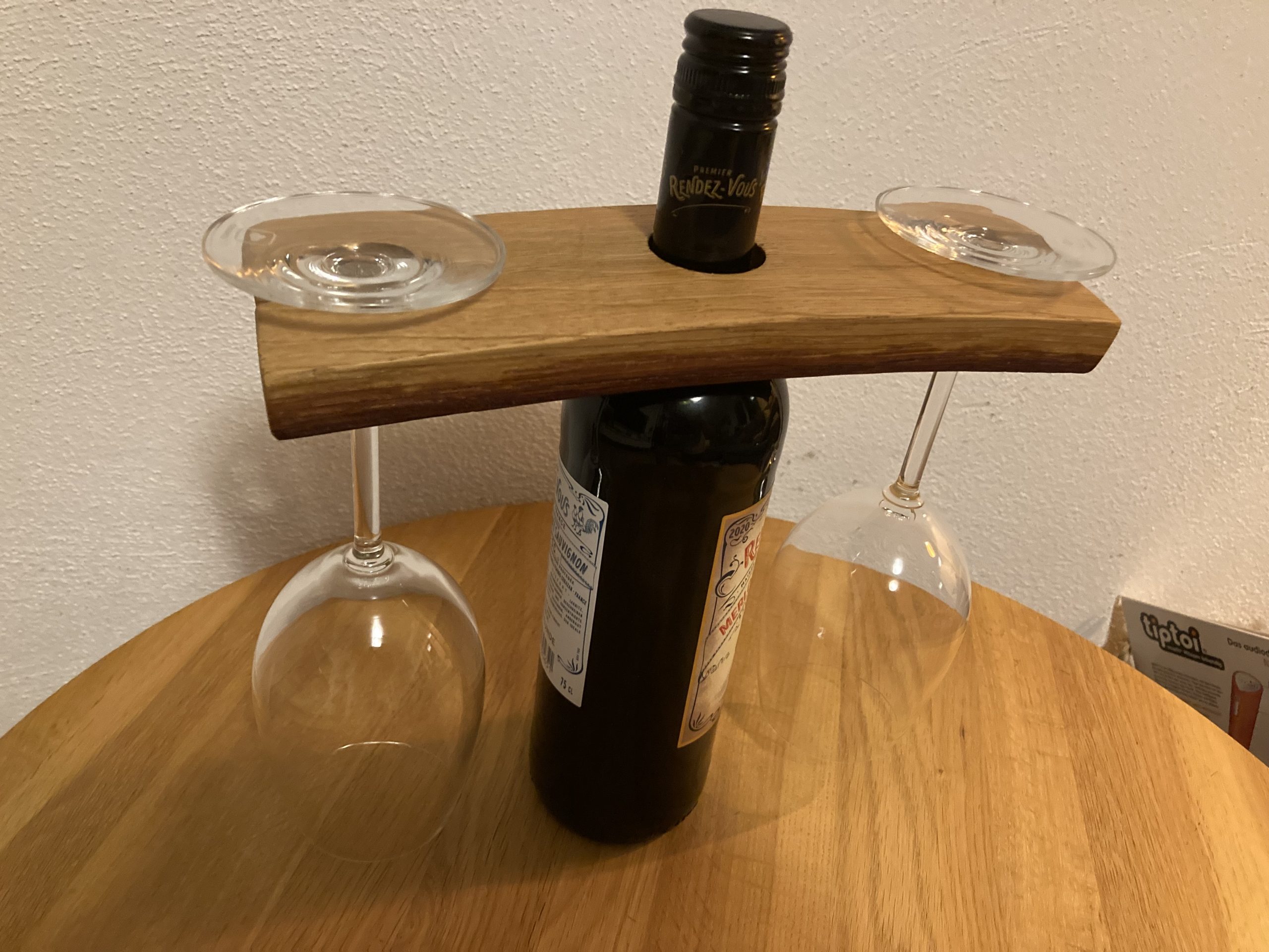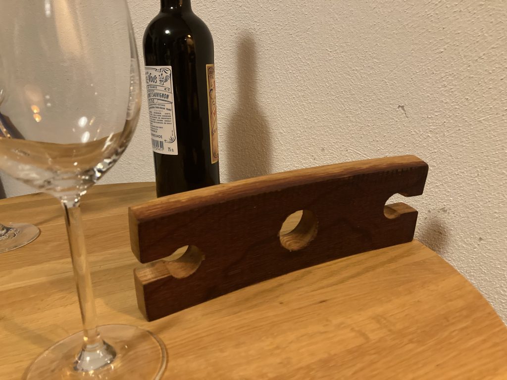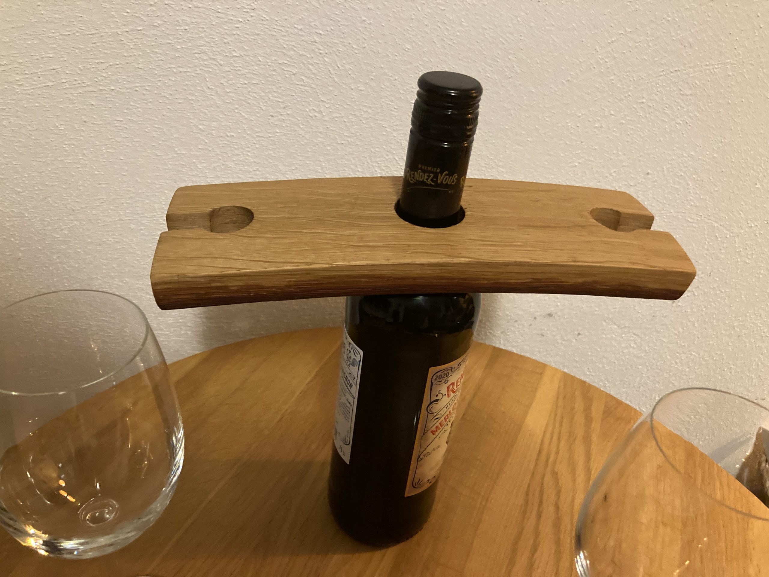 Eine Rotweinfassdaube wurde mit dem Forstnerbohrer auf Flaschenhals & Glasstiehlgröße gebohrt.