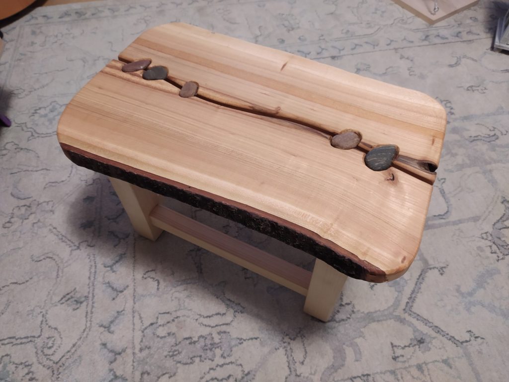 Ein Rohling aus Robinie mit Rindenrand, in der Mitte ein Griff aus Eiche eingelassen, in dem ein „Linsenstein“ liegt. Das sind in der vorletzten Eiszeit linsenförmig geschliffene kleine Granite von der dänischen Westküste.