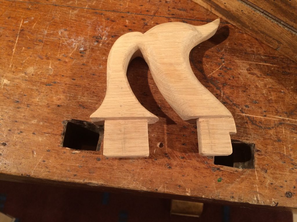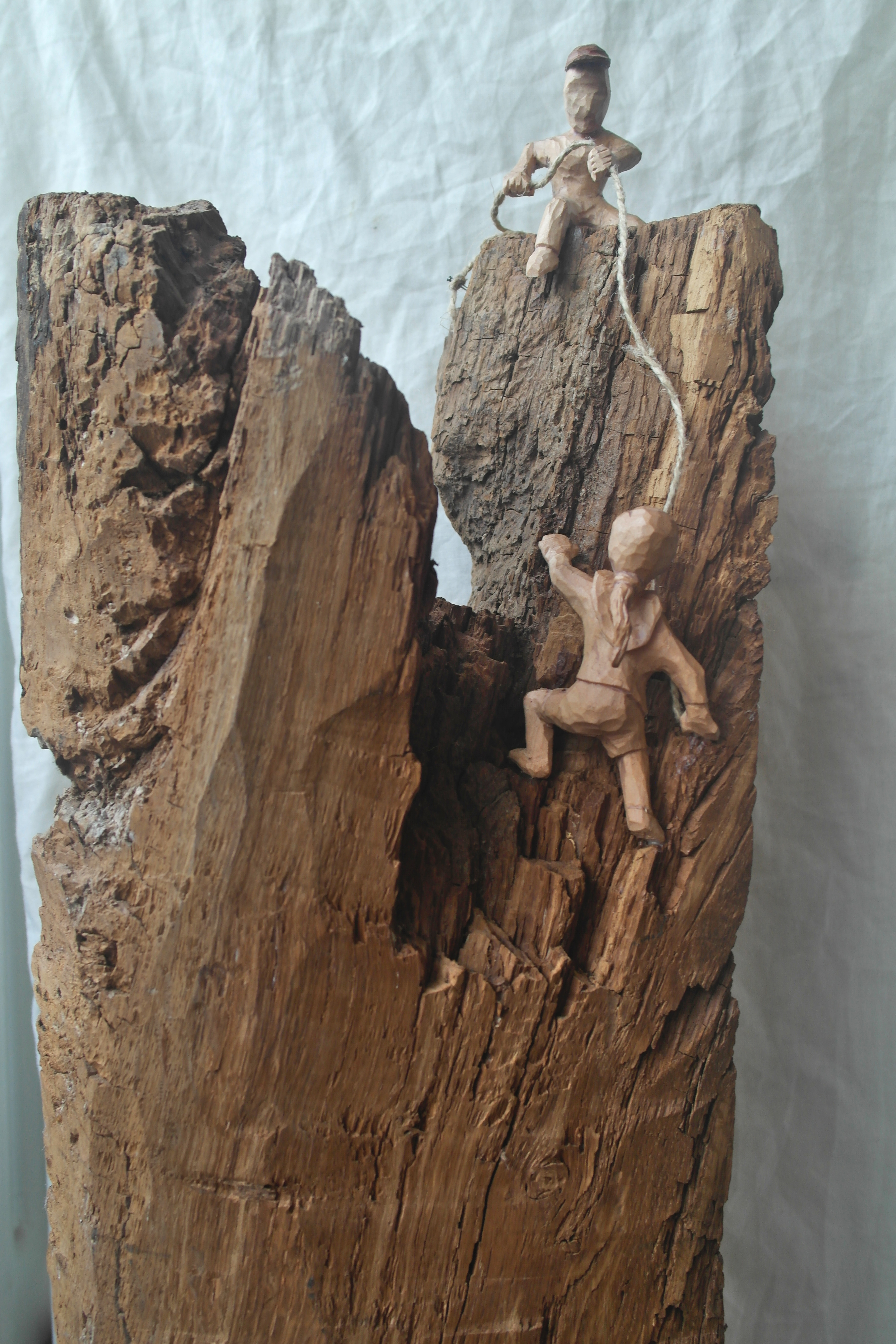 Mit einem Ziehmesser entfernte ich den Schmutz der Jahrhunderte und glättete die Oberfläche. Dort wo sich einst ein Zapfenloch befand, ließ ich das stark verwitterte, fast schon korkartige Material stehen und schnitze zwei einfache Figuren aus Lindenholz, die in der entstandenen „Steilwand“ klettern.