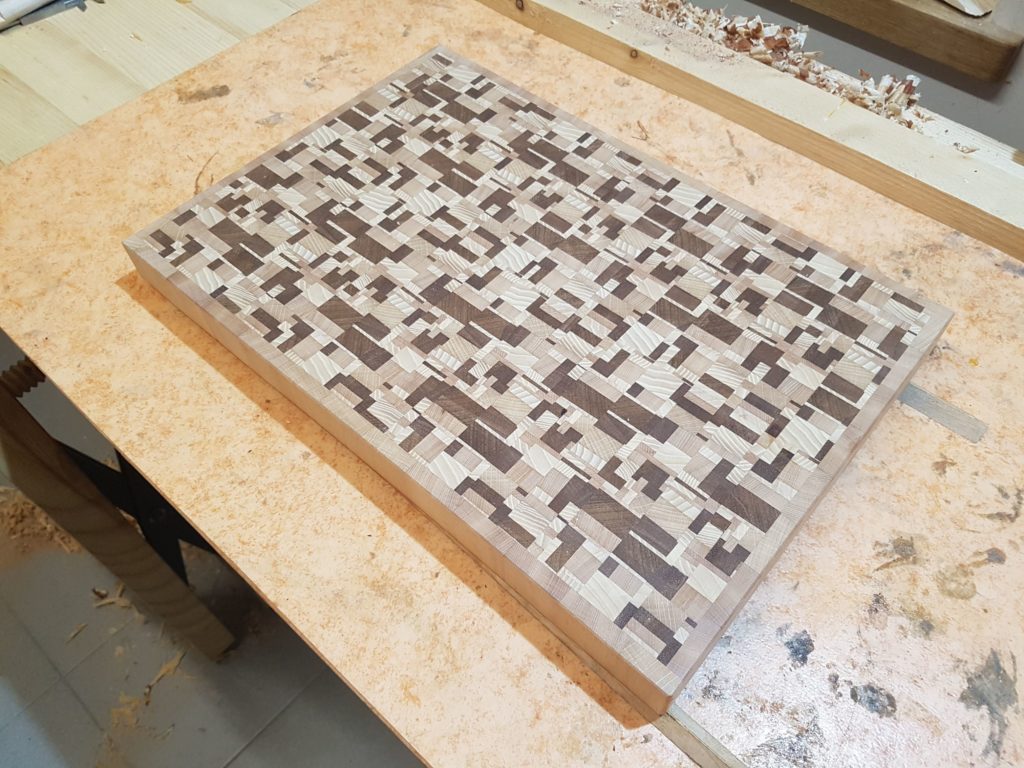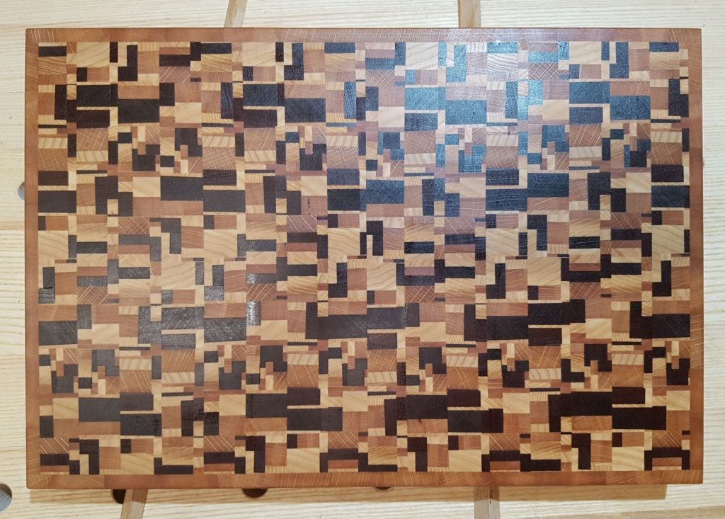 Als Geschenk zu einem runden Geburtstag sollte es etwas Besonderes sein. Ich hatte schon lange überlegt, ein Chaos-Muster-Schneidbrett zu fertigen. Ich wählte Holzleisten von kontrastreichen Hölzern aus; alle wurden auf eine Breite von 40 mm besäumt und hochkant verleimt. Mit einem kleinen Gummiroller, eigentlich zum Farbauftrag beim Linol-Druck vorgesehen, ging der Leimauftrag schnell von der Hand.