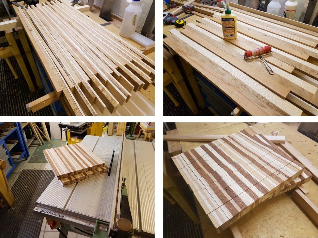 Anschließend wurde das Leimholz wieder in gleich breite Leisten aufgetrennt, um 90° gedreht und erneut verleimt. Dieser Vorgang wurde fünf mal wiederholt.