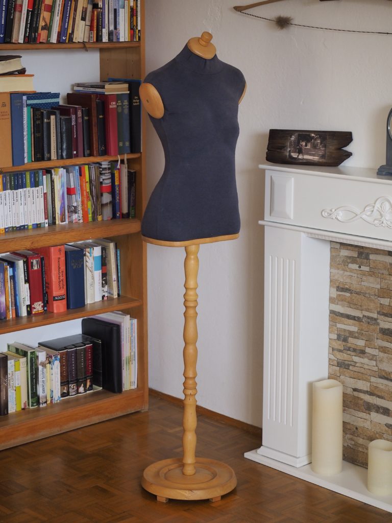 Für diese passgenaue Schneiderpuppe wurde ein Gipsabdruck des Oberkörpers (zwei Formhälften) hergestellt und diese 3cm dick mit einem Gemisch aus Korkgranulat (Terrarienbedarf) und Weißleim gefüllt.
