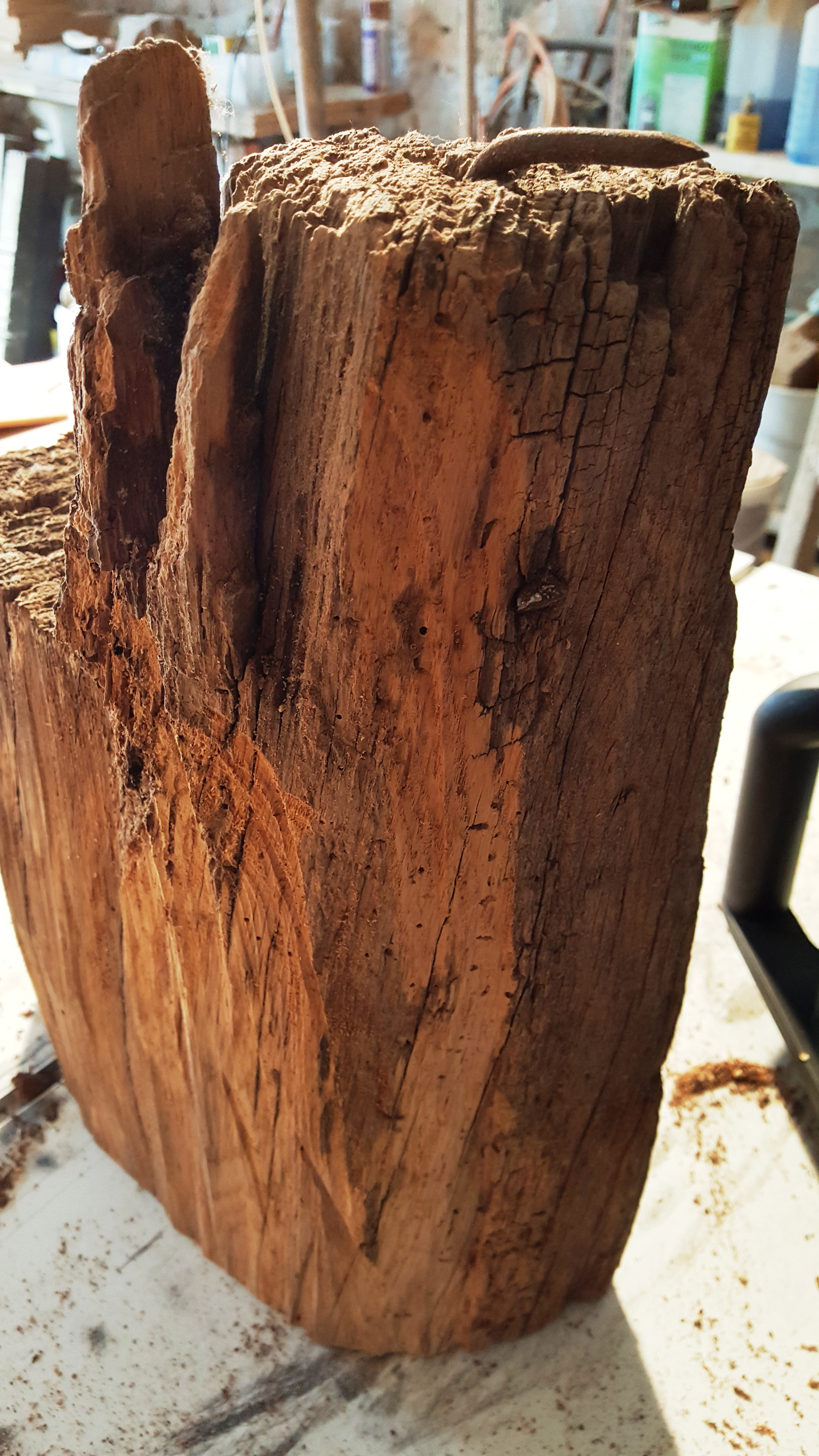 Auch an mir sind nach vielen Jahrhunderten die Zeichen der Zeit zu erkennen, ich bekam Risse und wurde morsch, also wurde ich ausgetauscht. Ich dachte schon jetzt ist mein langer Weg zu Ende und anders als erwartet kam dann doch noch ein neues Abenteuer auf mich zu, ich wurde eine Skulptur und war auf einmal wieder begehrenswert.