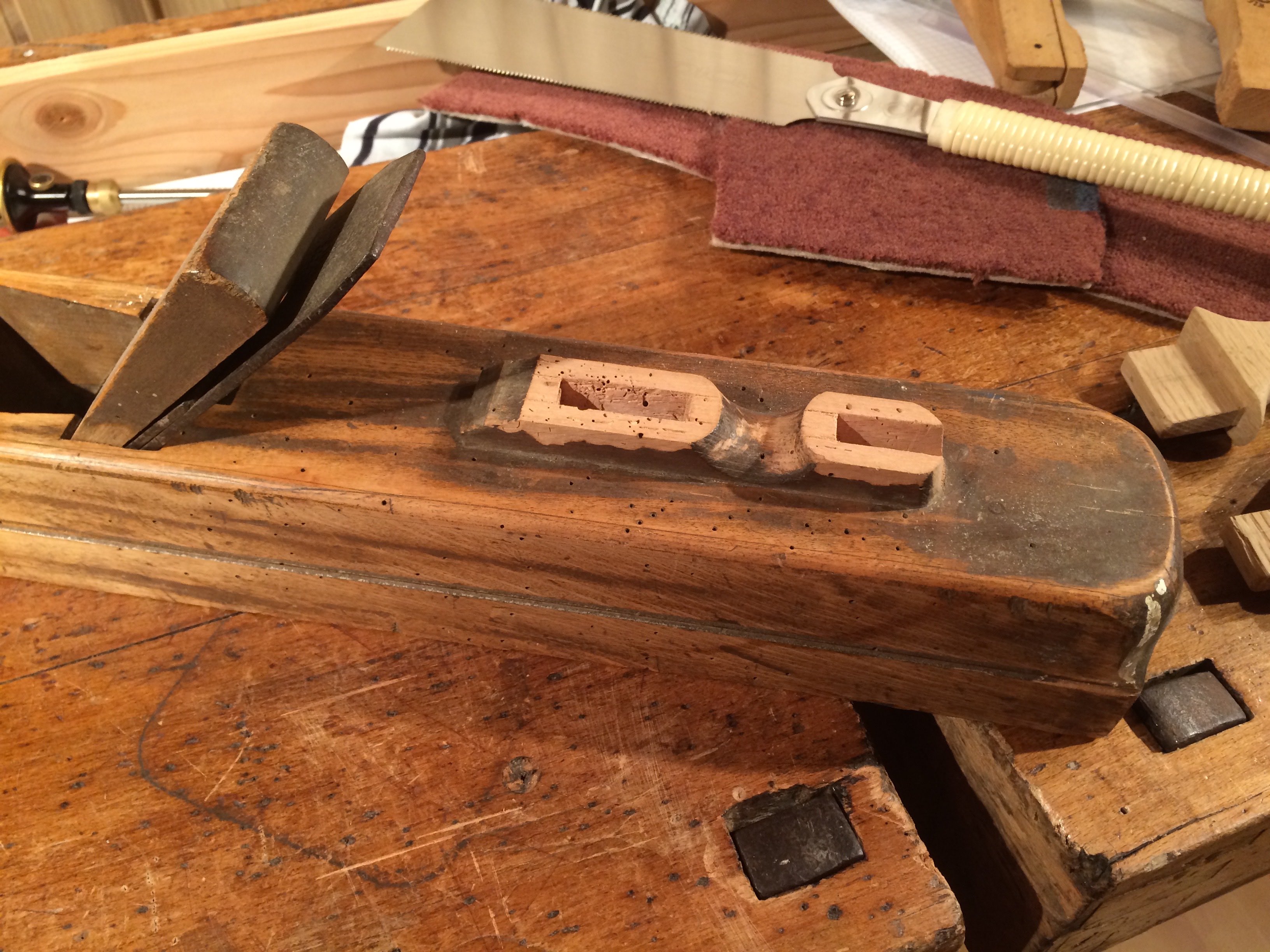 Bei dieser alten Raubank von meinem Urgroßvater war der Griff abgebrochen. Die Bruchstelle des alten Griffes wurde mit einem Hobel #4 plangehobelt und es wurden zwei neue Zapfenlöcher in den alten Griff mit einem 10mm DICTUM-Stemmeisen gestemmt.