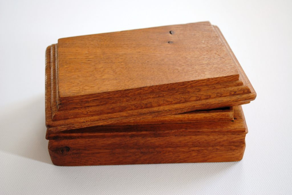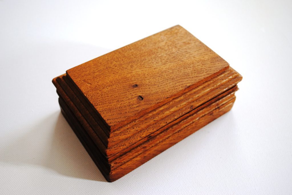 Das Druckkästchen wurde aus einem über hundert Jahre alten Stück Eiche hergestellt, Kästchen und Deckel waren ursprünglich ein Stück, was man auch sehr gut an der Maserung des Holzes erkennen kann.