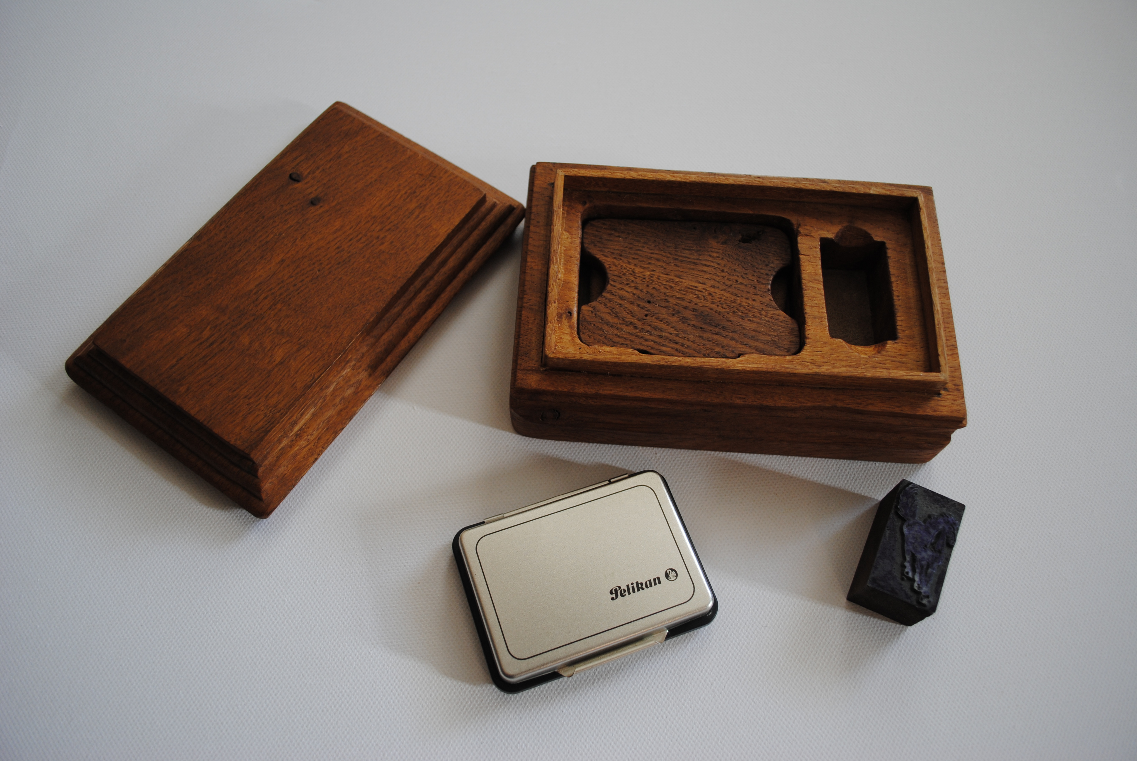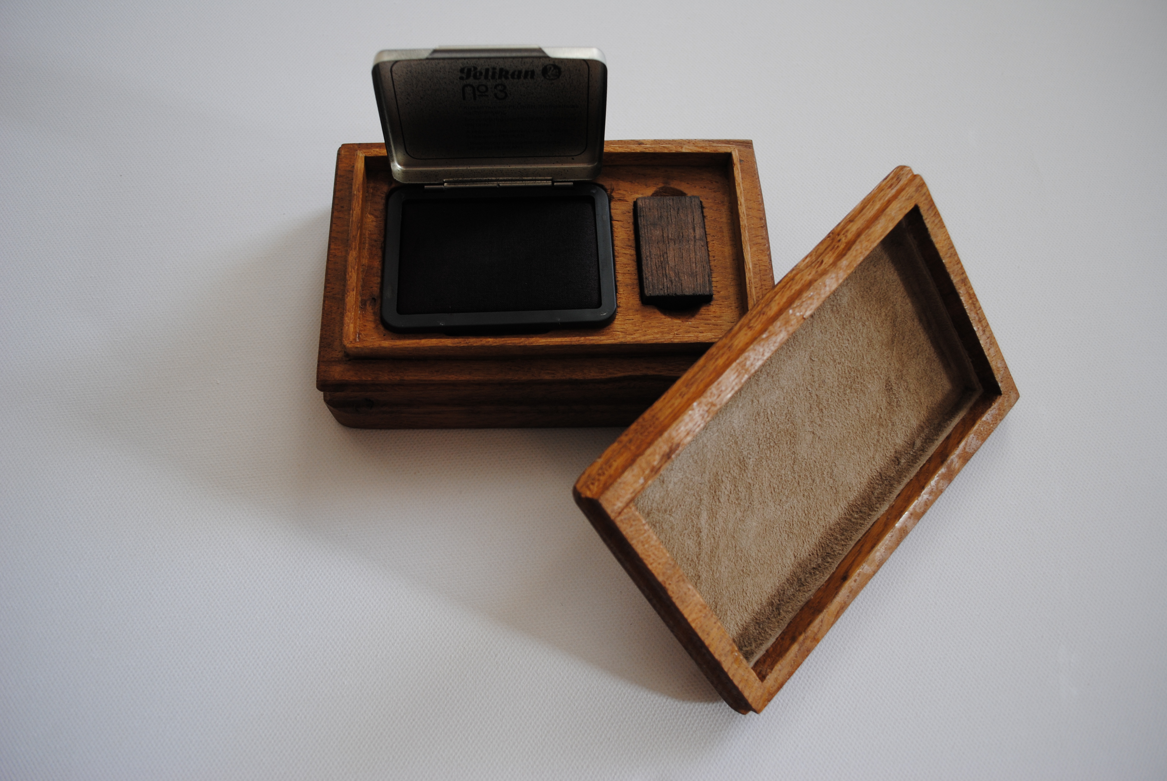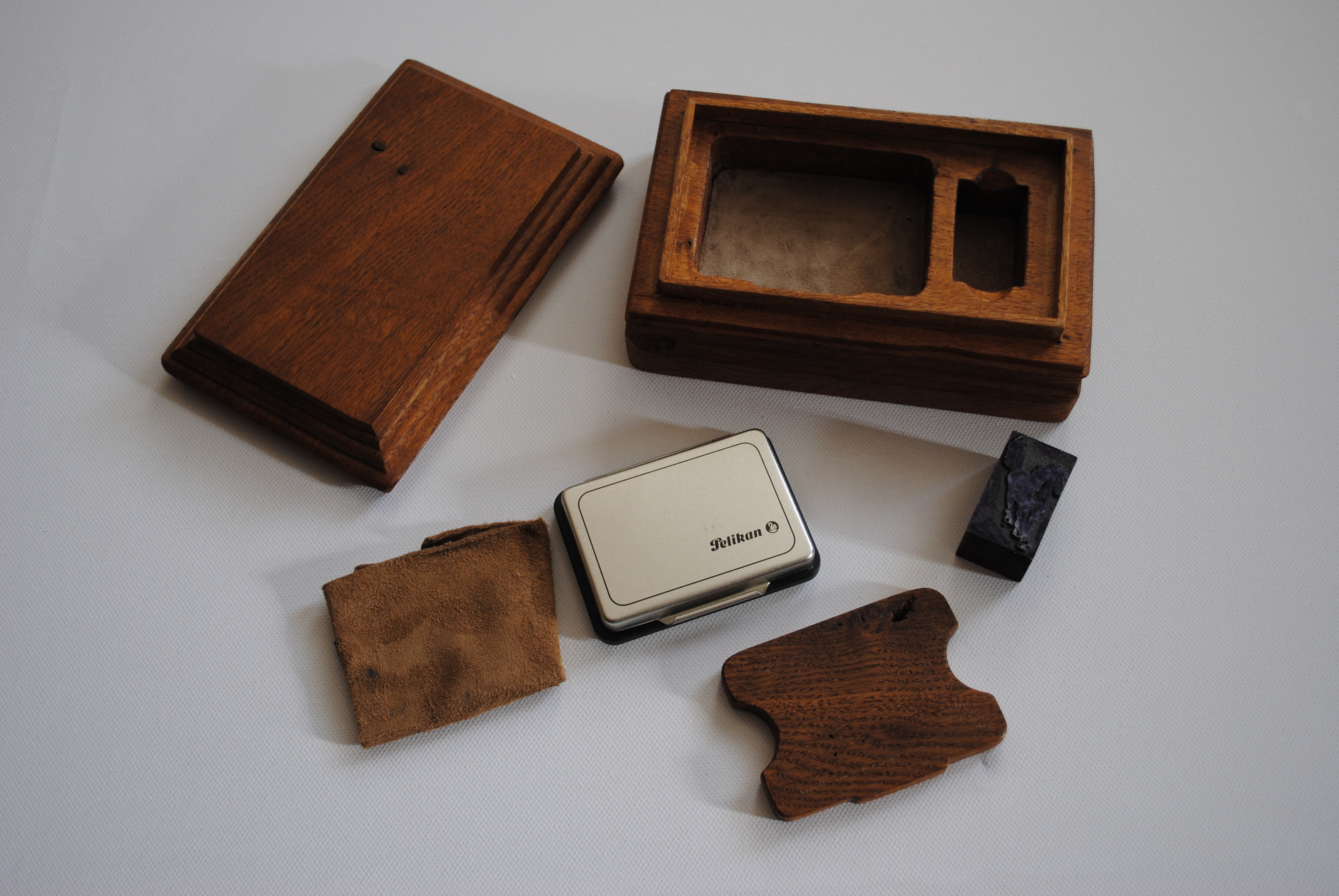 Das Kästchen ist an Deckel und Boden innen mit Wildleder ausgelegt, unter dem Stempelkissen ist ein herausnehmbarer Boden, in dem sich ein Stück Wildleder zum Reinigen des Stempels befindet.
